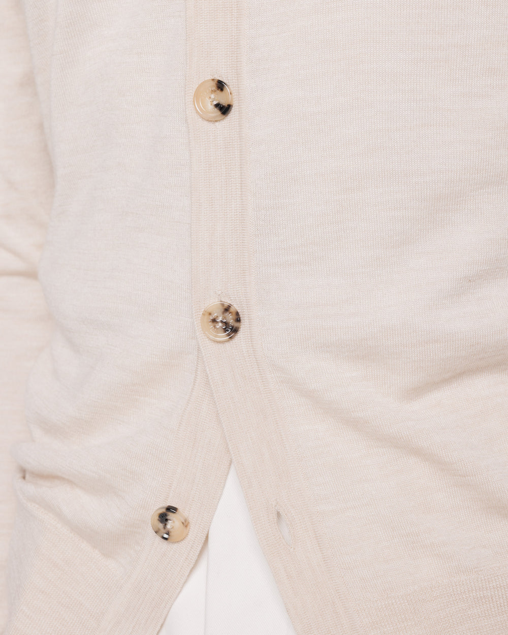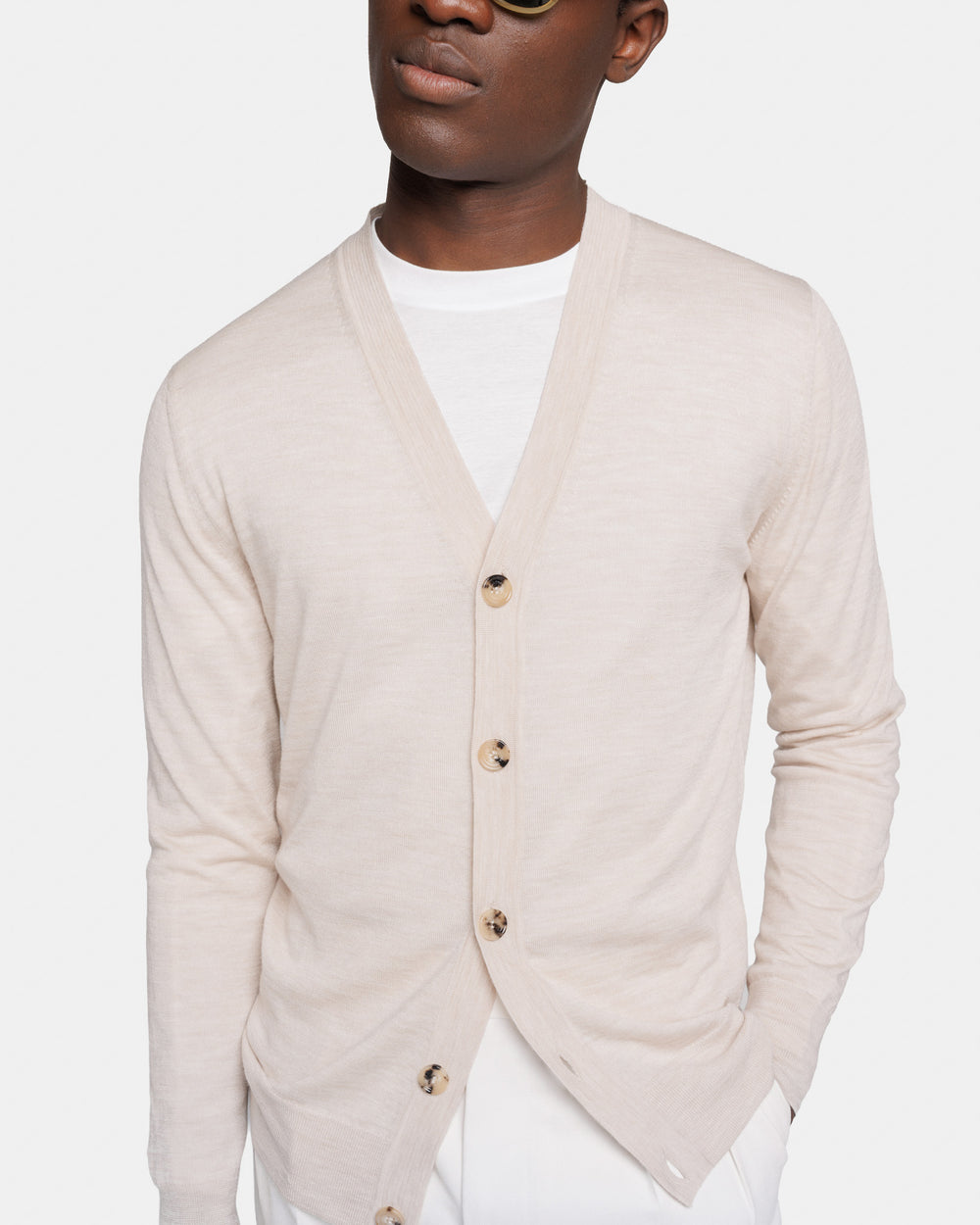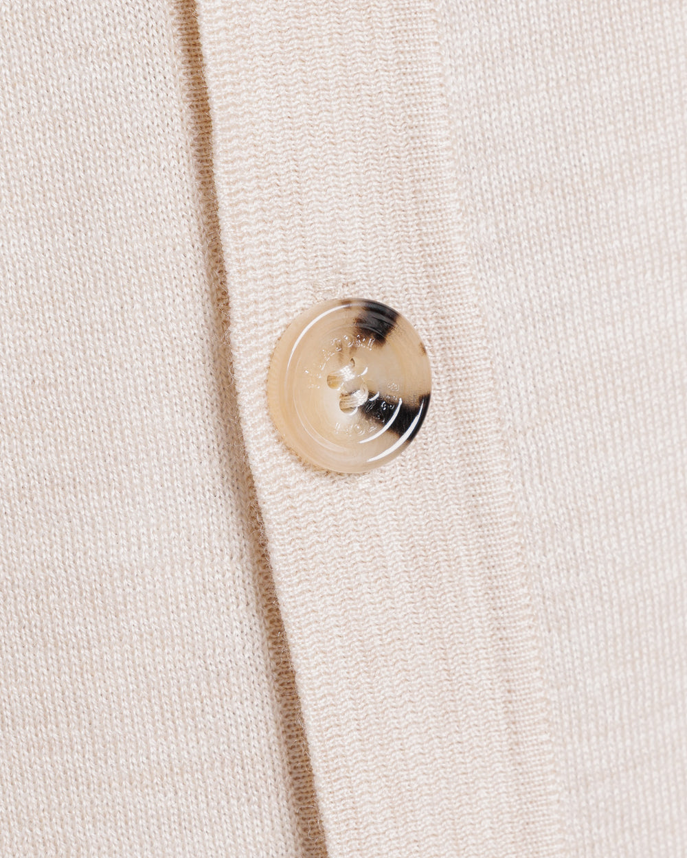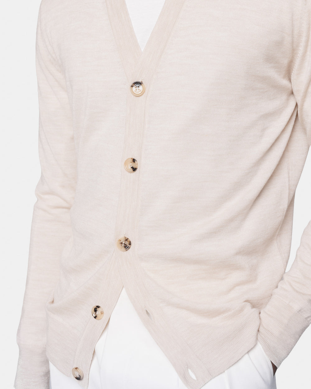 Tailor-made long sleeved cardigan with a refined V-neck and a front closure with five authentic 32 mm Horn buttons in Extrafine 2/48 Gauge Yarn, Solid Beige. Crafted from a luxurious, bright, and soft blend of 70% Extrafine Merino Wool and 30% Silk of exceptional quality.