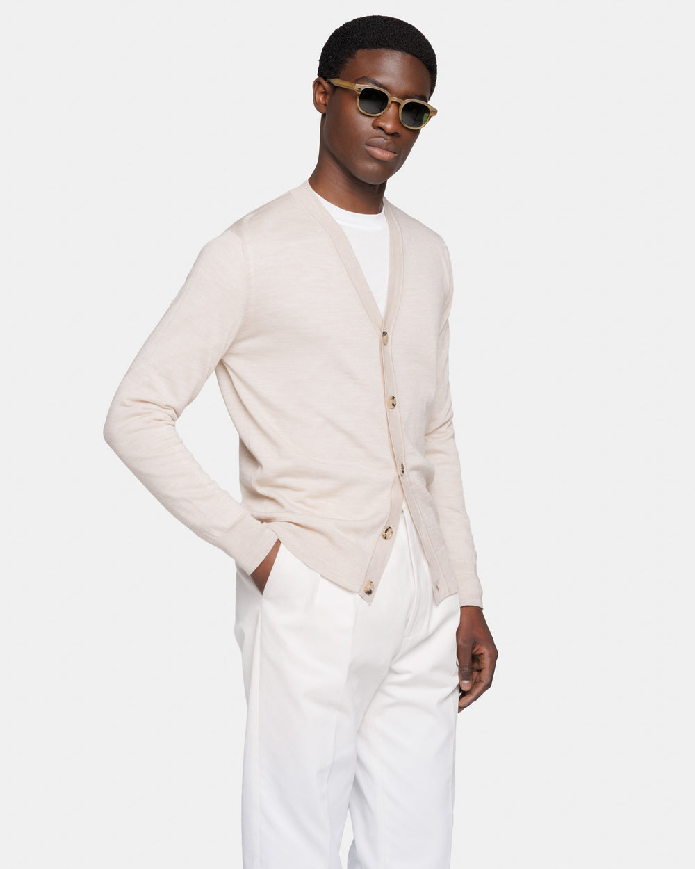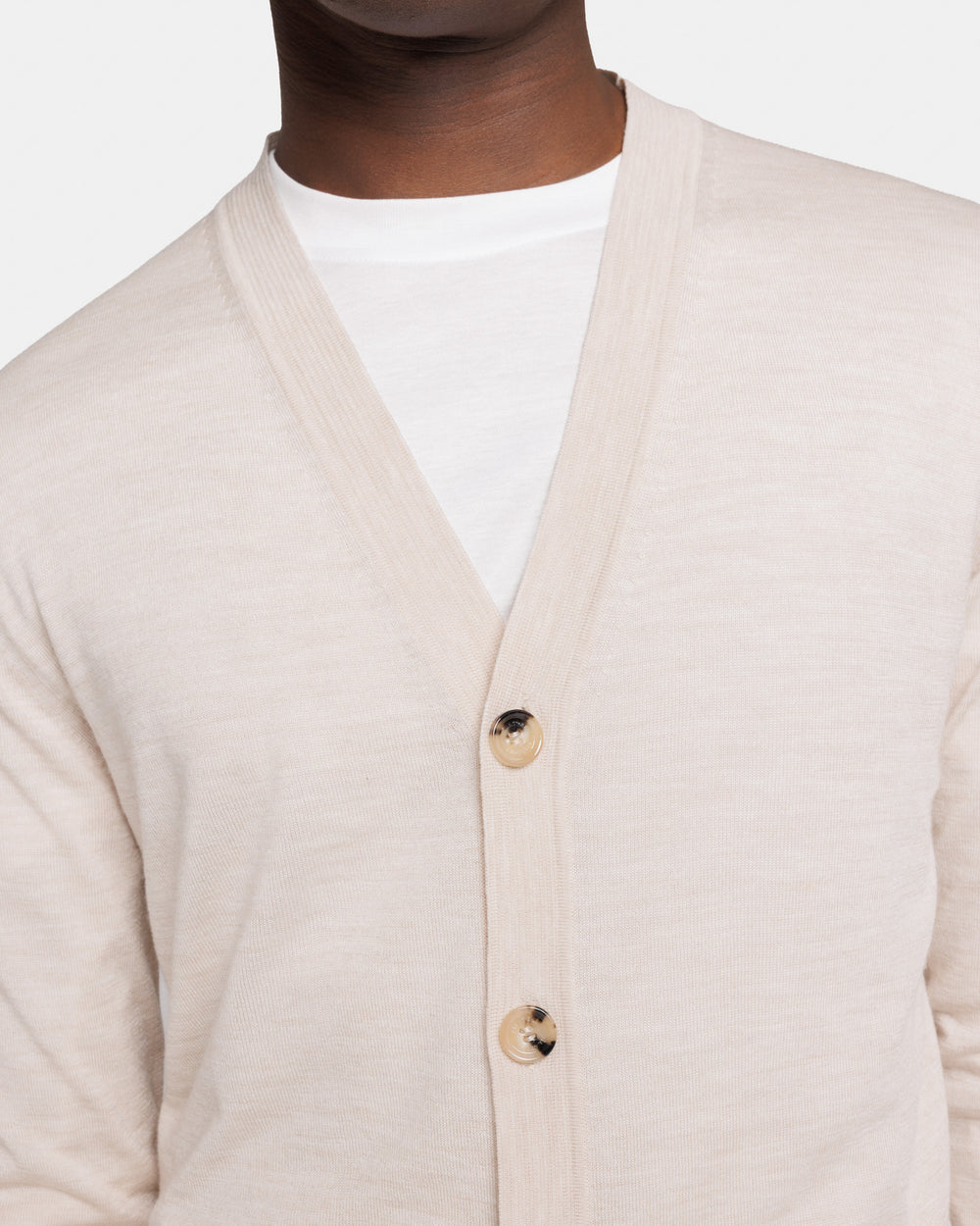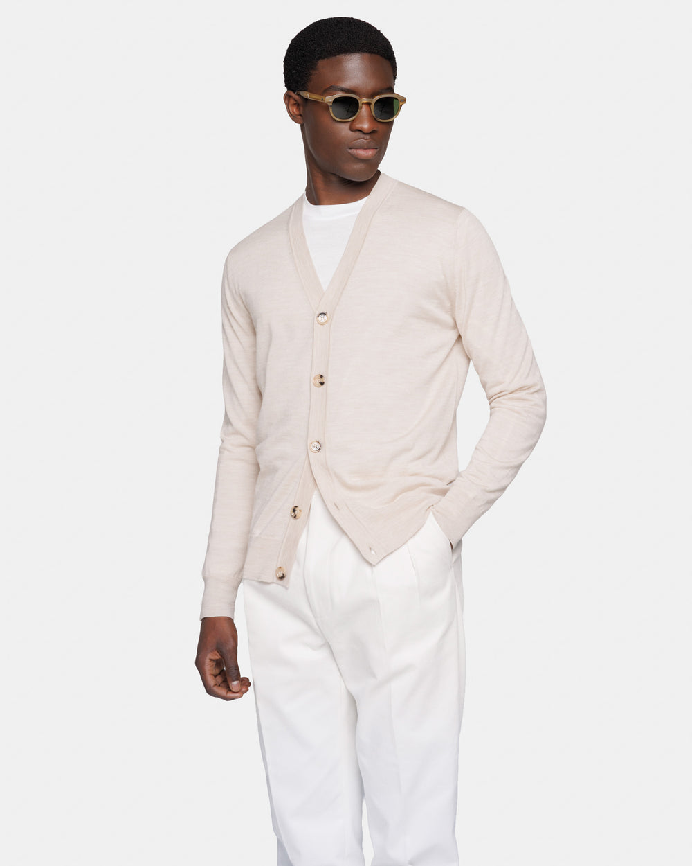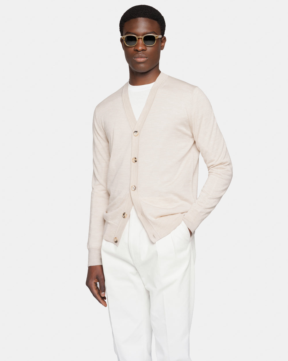 Tailor-made long sleeved cardigan with a refined V-neck and a front closure with five authentic 32 mm Horn buttons in Extrafine 2/48 Gauge Yarn, Solid Beige. Crafted from a luxurious, bright, and soft blend of 70% Extrafine Merino Wool and 30% Silk of exceptional quality.