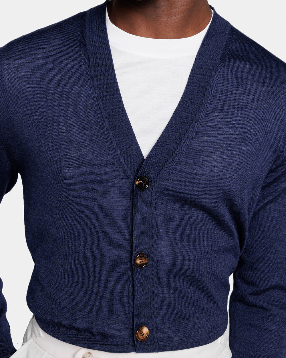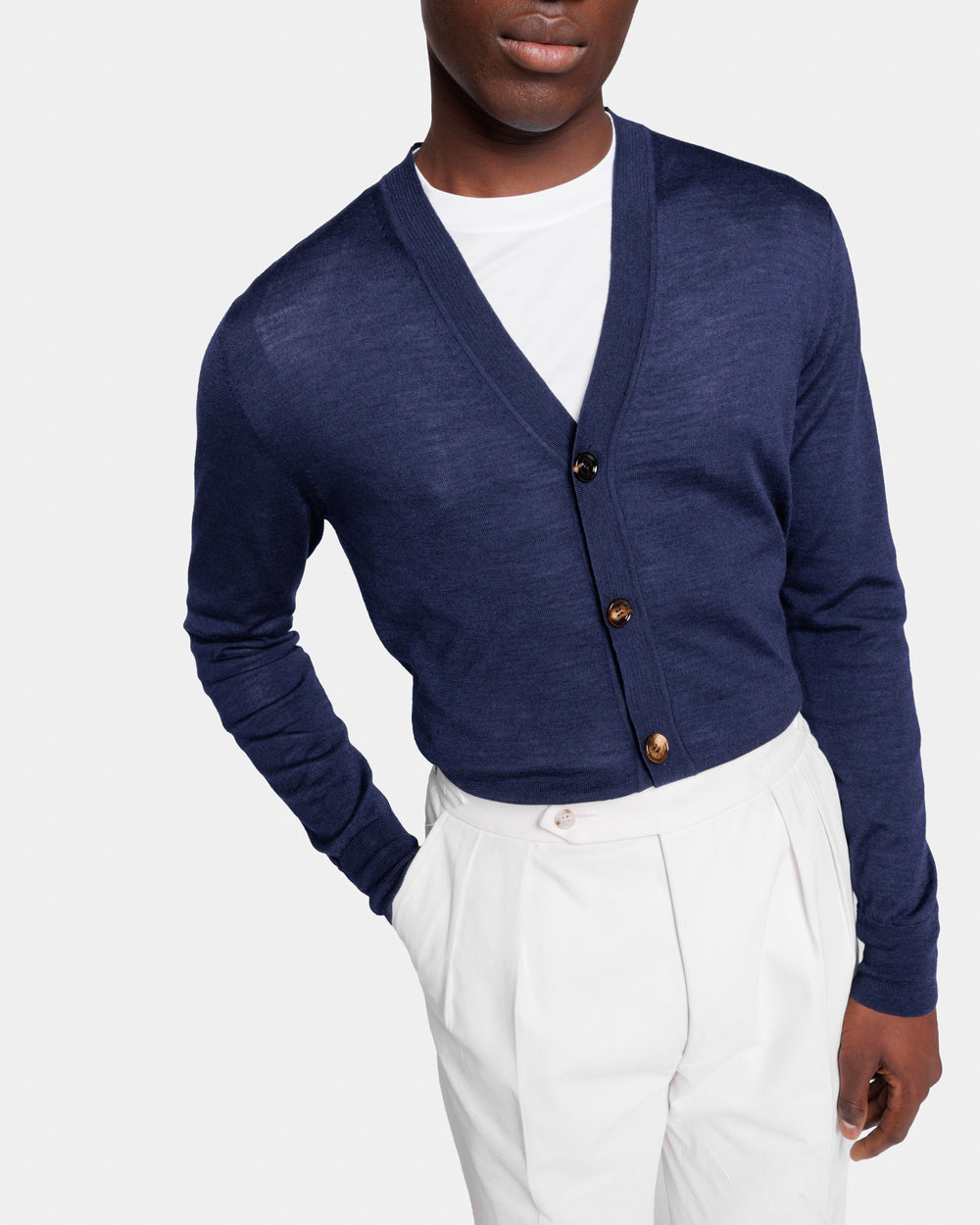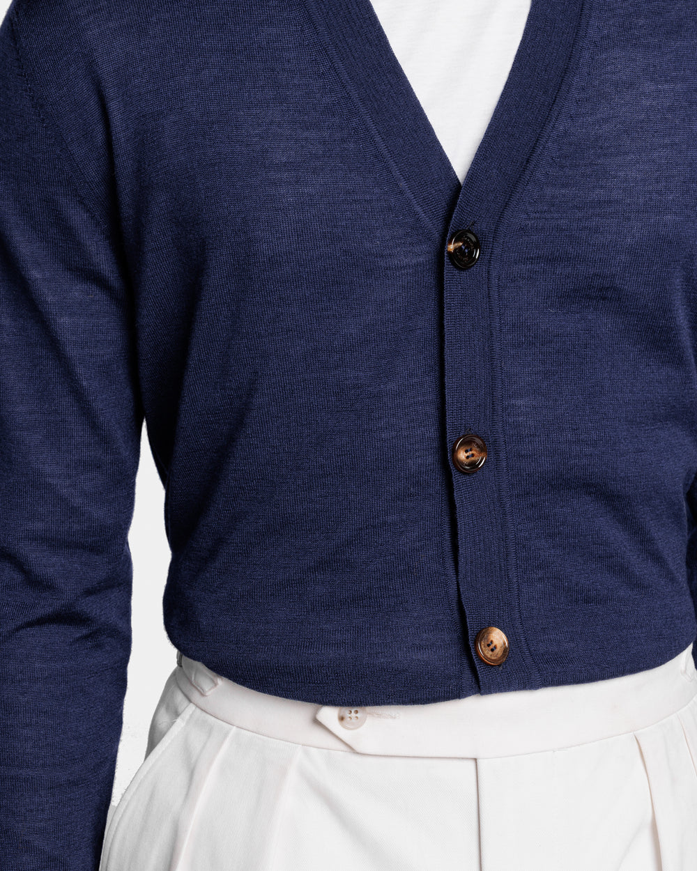 Tailor-made long sleeved cardigan with a refined V-neck and a front closure with five authentic 32 mm Horn buttons in Extrafine 2/48 Gauge Yarn, Solid Blue. Crafted from a luxurious, bright, and soft blend of 70% Extrafine Merino Wool and 30% Silk of exceptional quality.