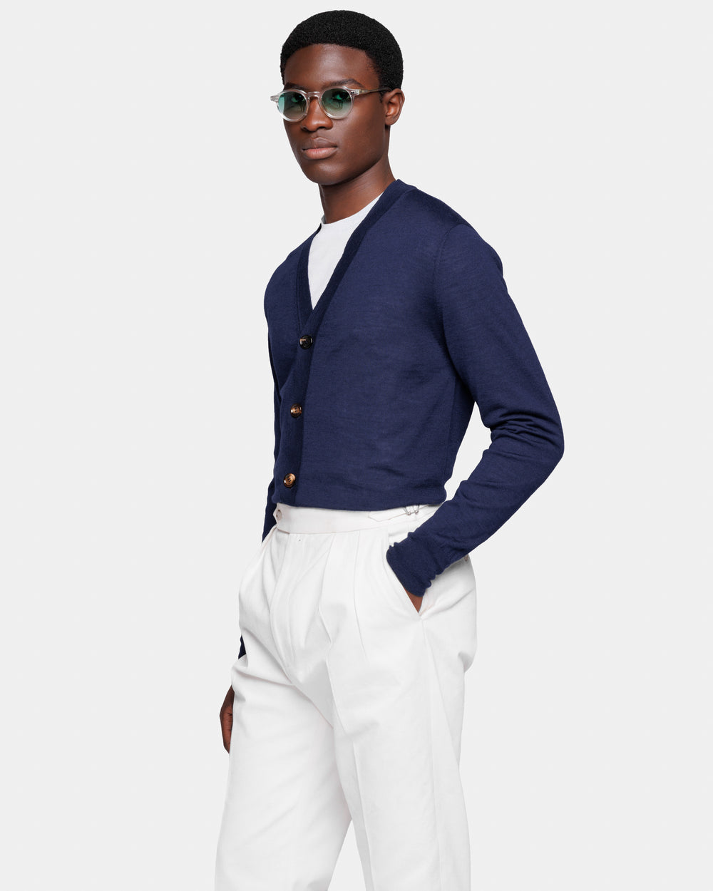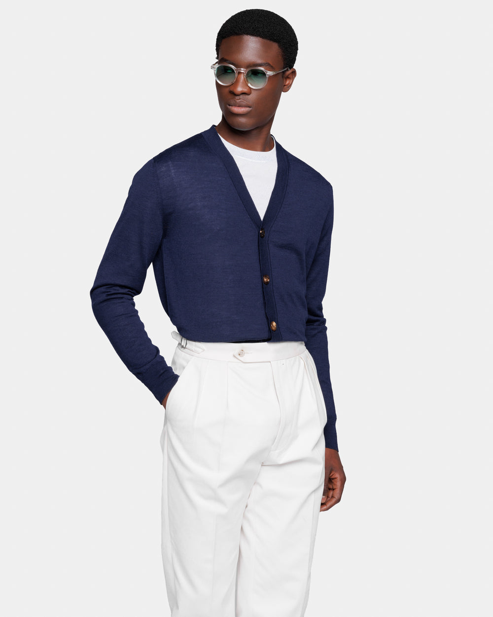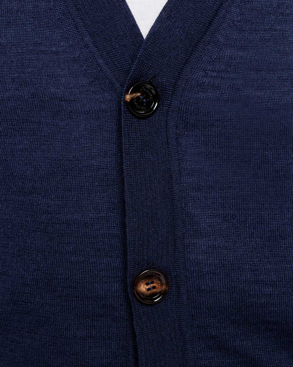 Tailor-made long sleeved cardigan with a refined V-neck and a front closure with five authentic 32 mm Horn buttons in Extrafine 2/48 Gauge Yarn, Solid Blue. Crafted from a luxurious, bright, and soft blend of 70% Extrafine Merino Wool and 30% Silk of exceptional quality.