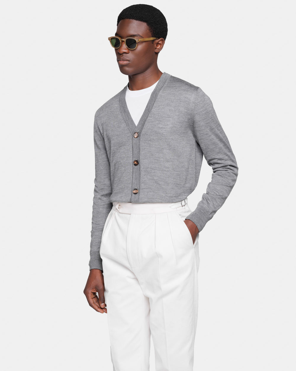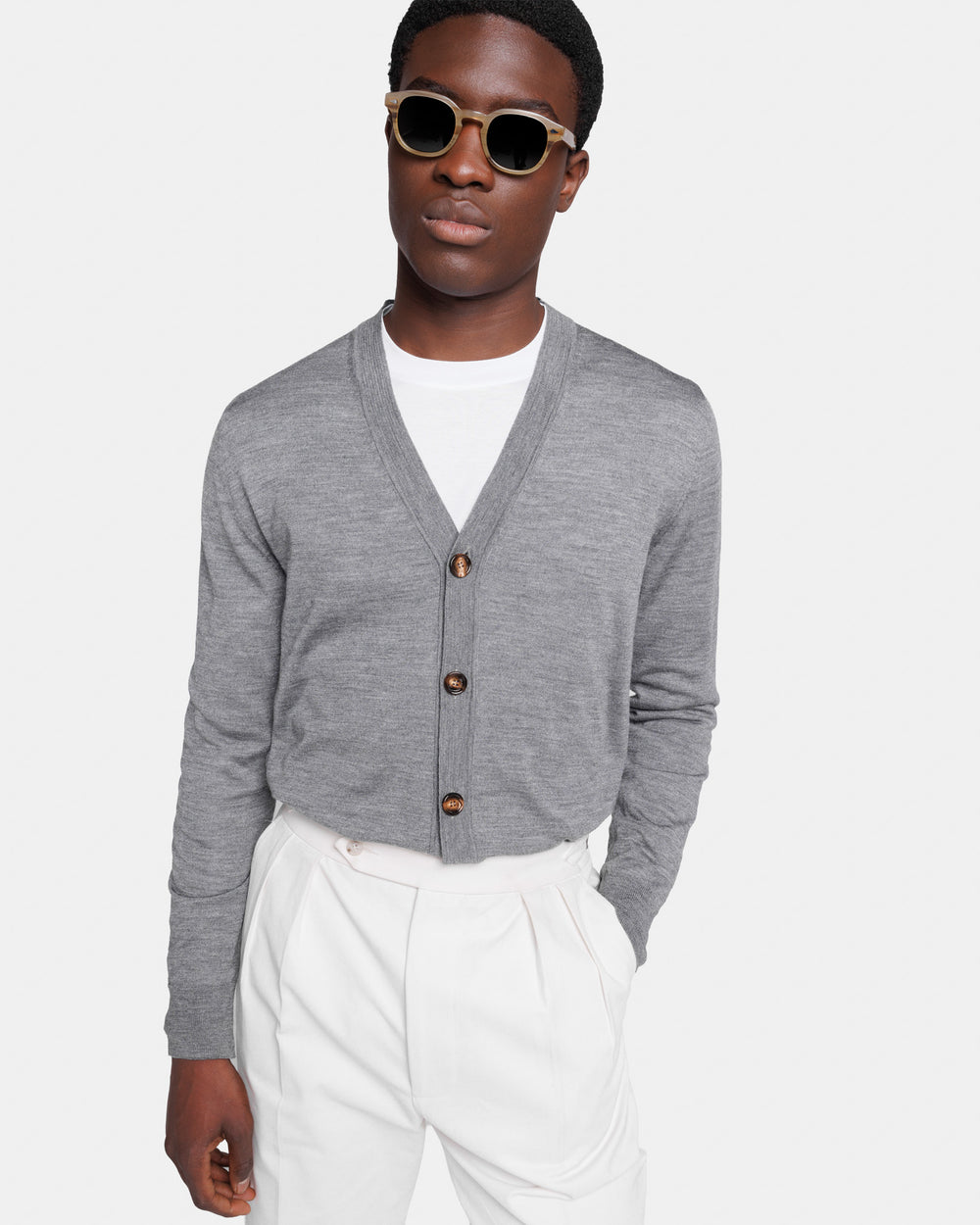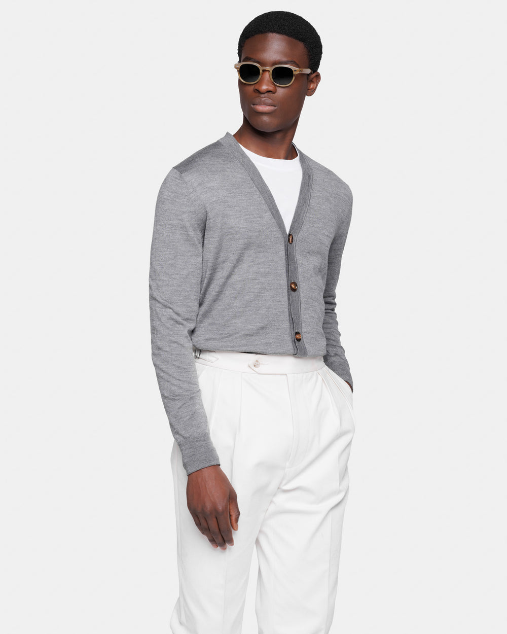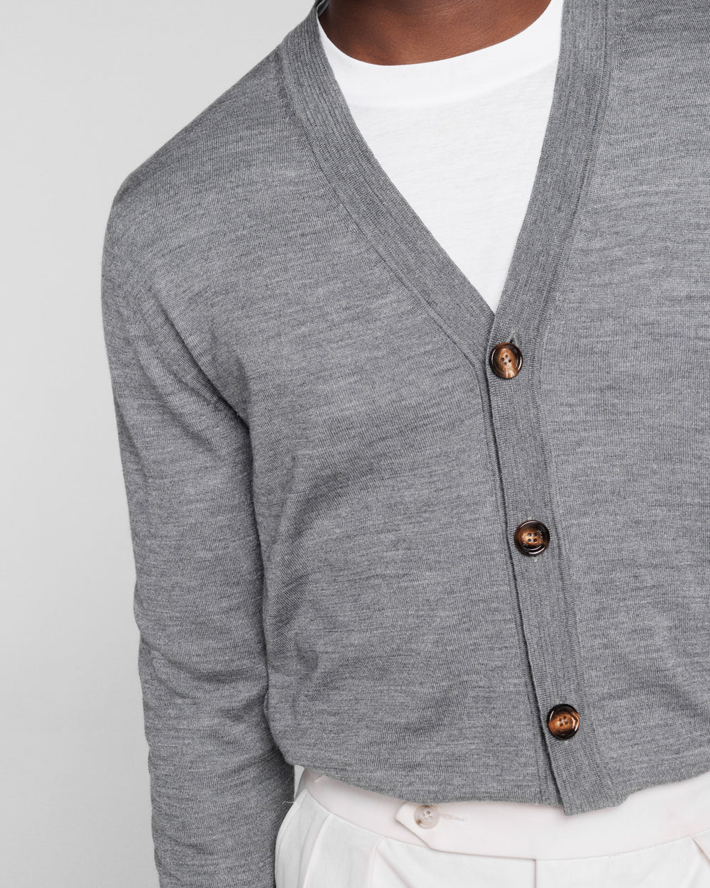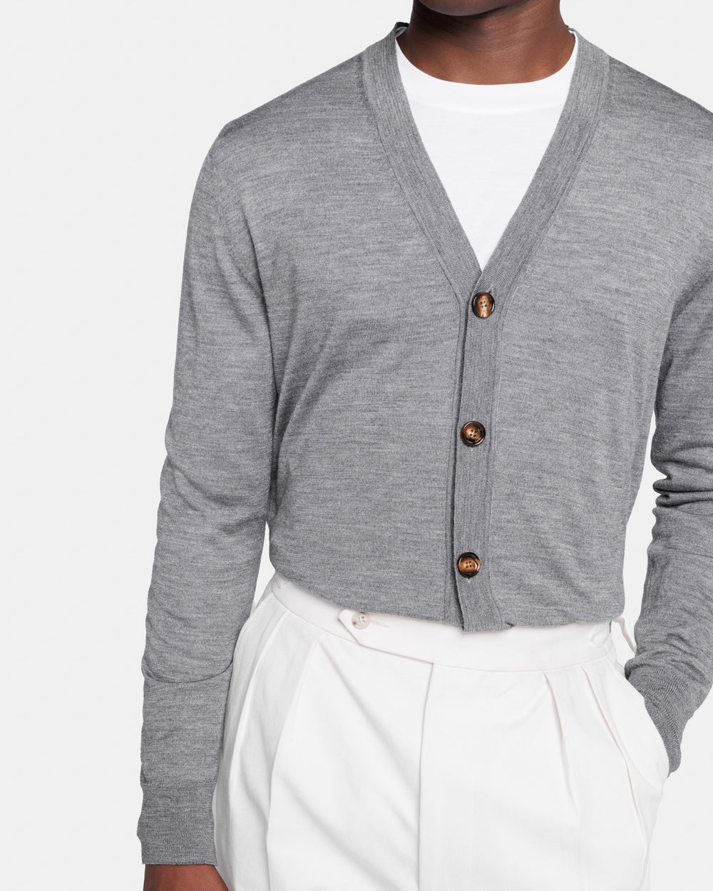 Tailor-made long sleeved cardigan with a refined V-neck and a front closure with five authentic 32 mm Horn buttons in Extrafine 2/48 Gauge Yarn, Solid Grey. Crafted from a luxurious, bright, and soft blend of 70% Extrafine Merino Wool and 30% Silk of exceptional quality.