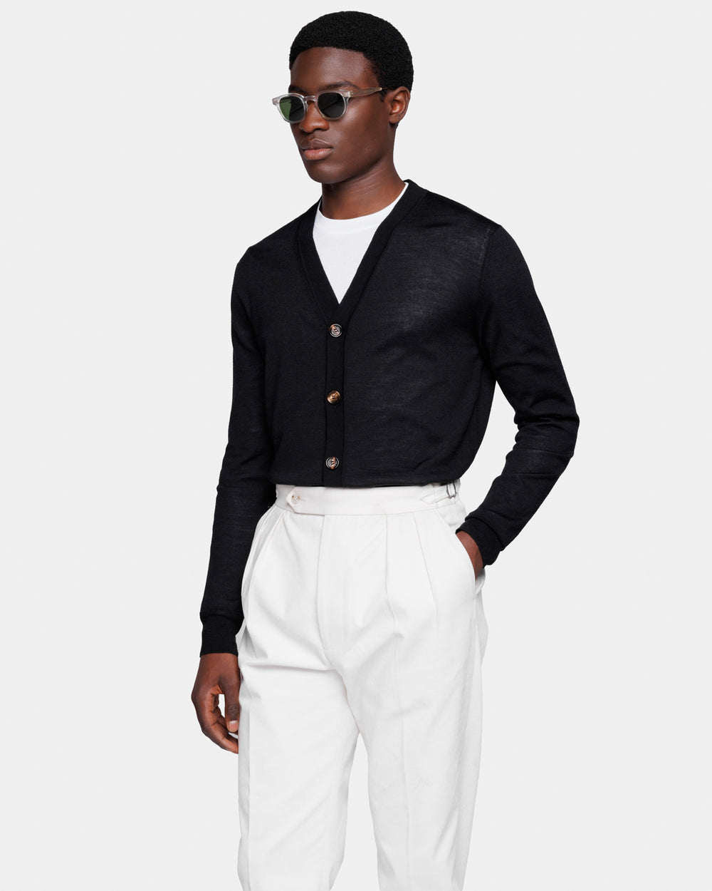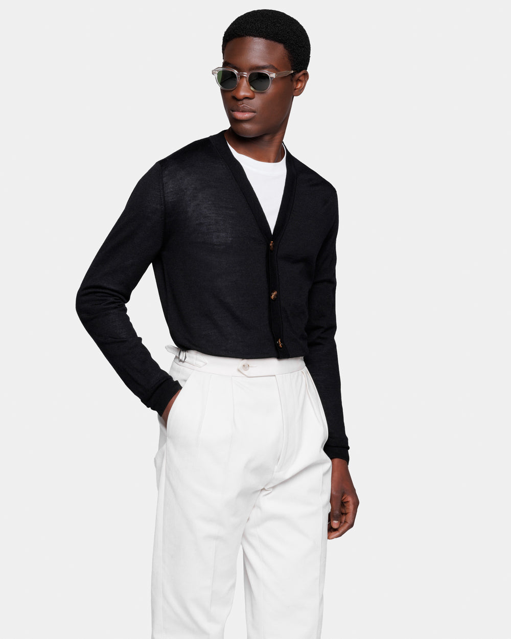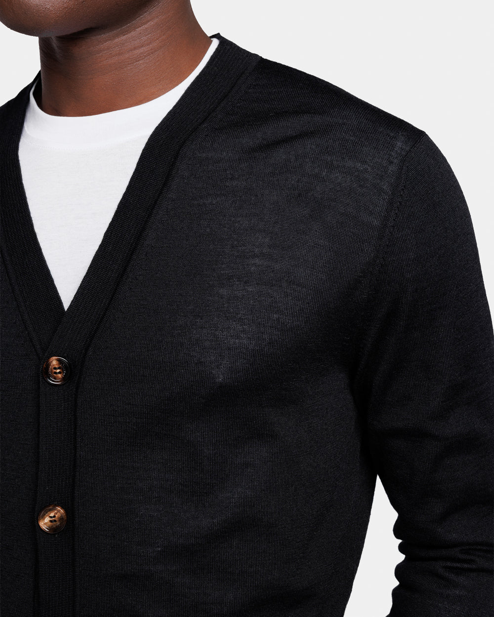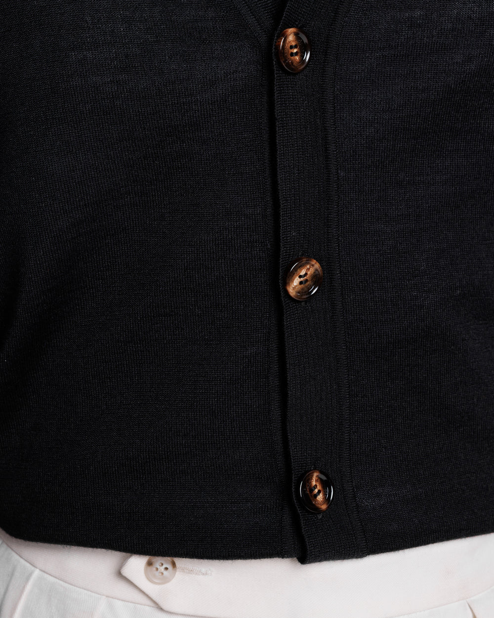 Tailor-made long sleeved cardigan with a refined V-neck and a front closure with five authentic 32 mm Horn buttons in Extrafine 2/48 Gauge Yarn, Solid Black. Crafted from a luxurious, bright, and soft blend of 70% Extrafine Merino Wool and 30% Silk of exceptional quality.
