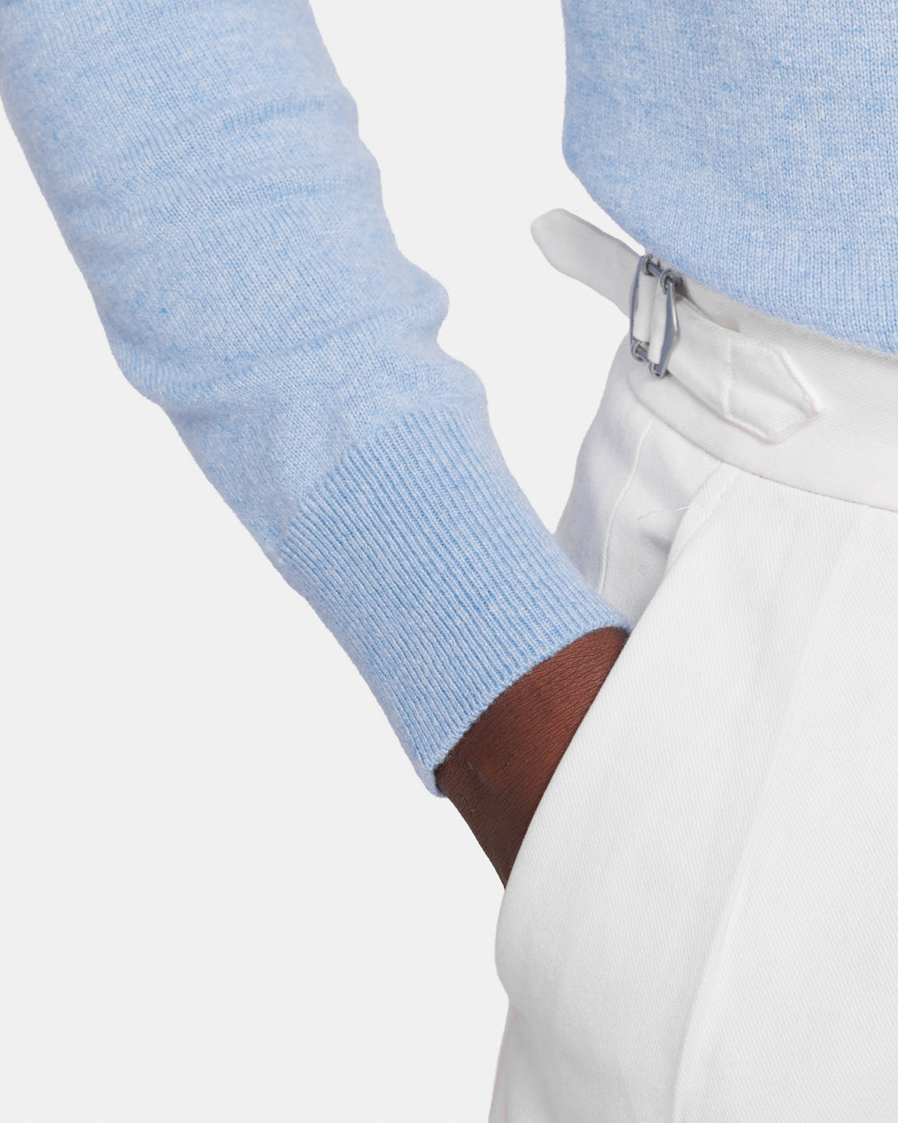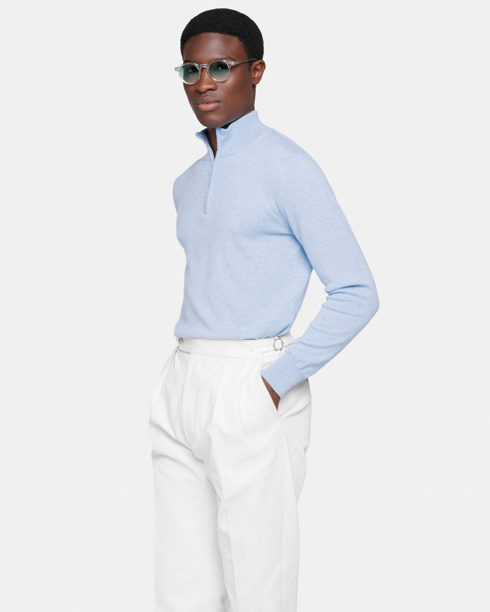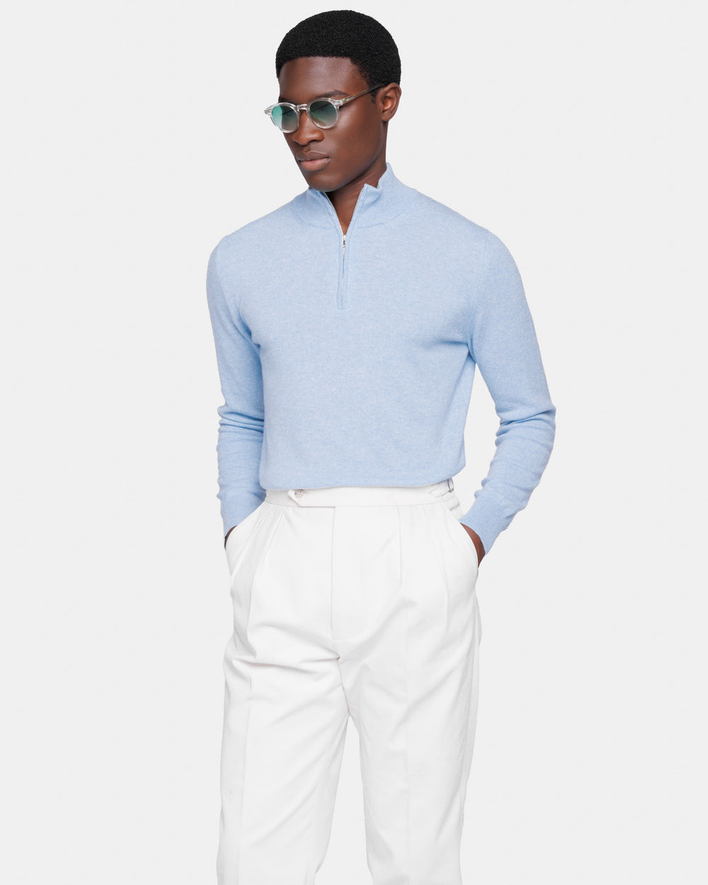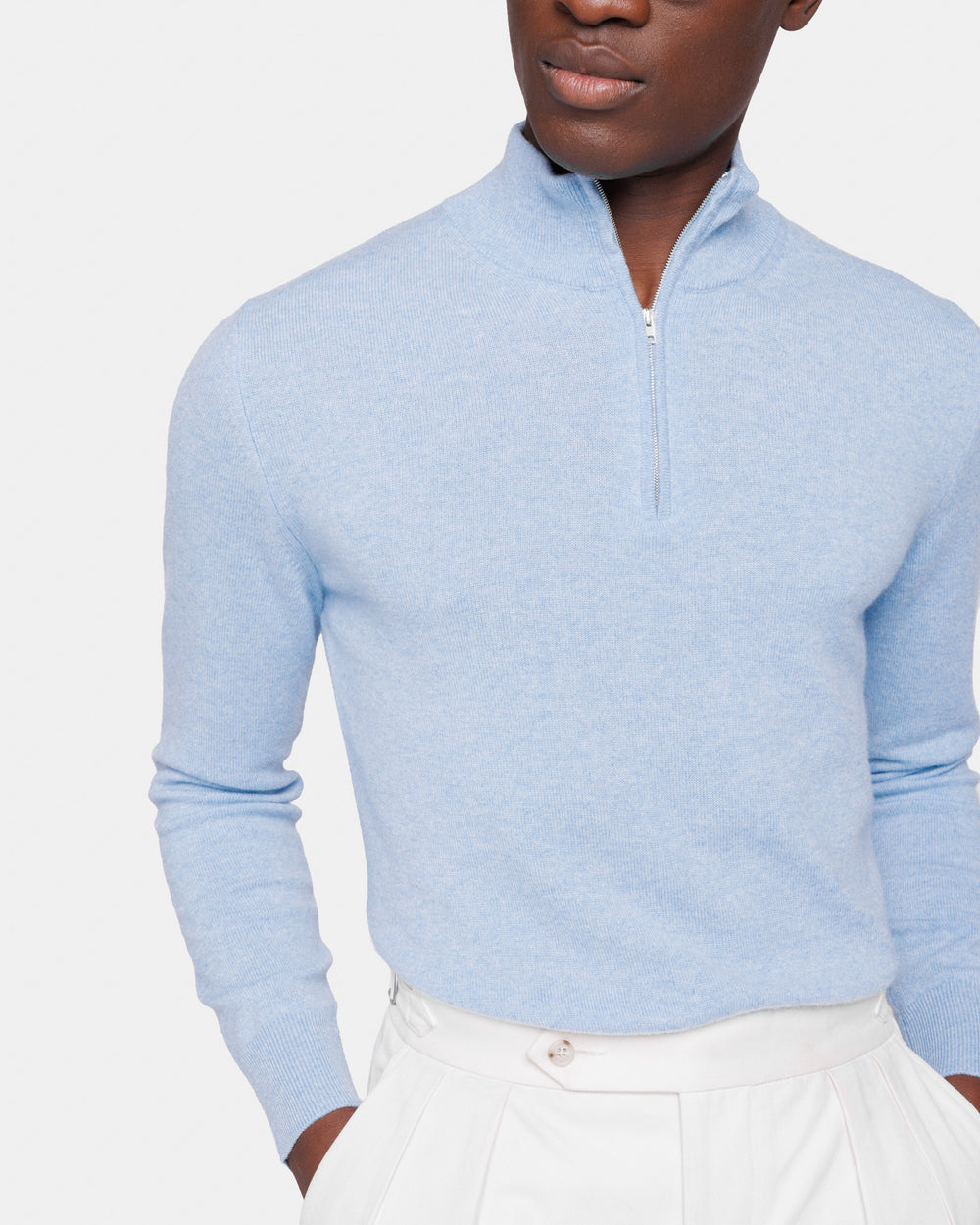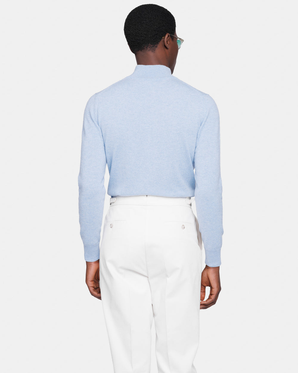 Tailor-made 1-ply half zip knit with a 20 cm Riri zipper, 2/27 yarn gauge, long sleeves, in sky blue color, made from a precious, refined, and ultra-fine pure cashmere Crown Reserve fiber coming from the most remote regions of Mongolia, then reaching the mills of Quarona Sesia in Piedmont, where it is skillfully processed by the world’s most prestigious spinning mill to give life to a 2/27 carded yarn.