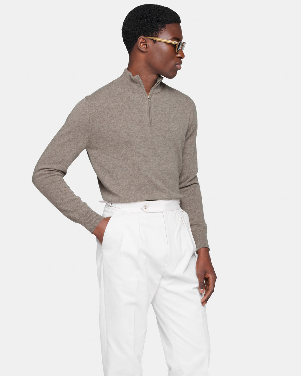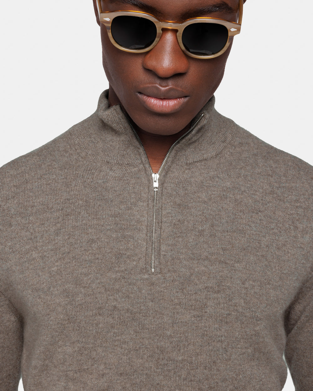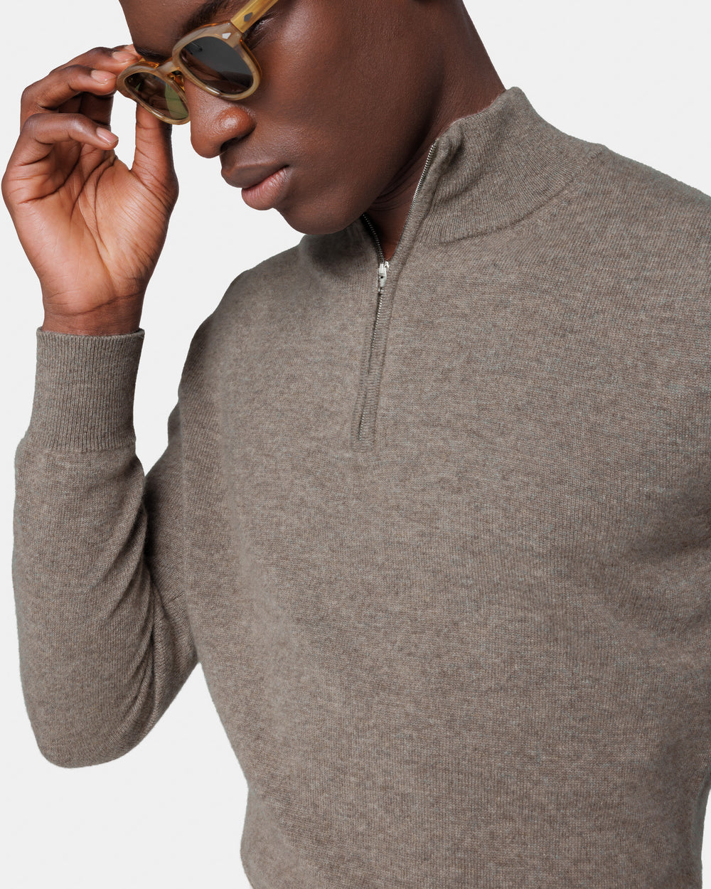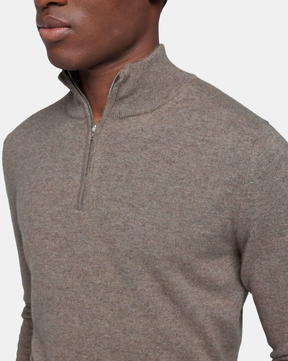 Tailor-made 1-ply half zip knit with a 20 cm Riri zipper, 2/27 yarn gauge, long sleeves, in taupe color, made from a precious, refined, and ultra-fine pure cashmere Crown Reserve fiber coming from the most remote regions of Mongolia, then reaching the mills of Quarona Sesia in Piedmont, where it is skillfully processed by the world’s most prestigious spinning mill to give life to a 2/27 carded yarn.