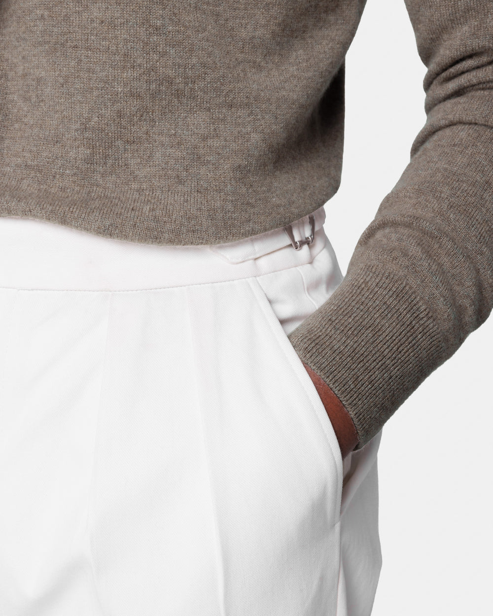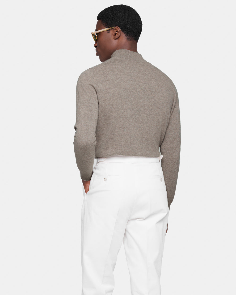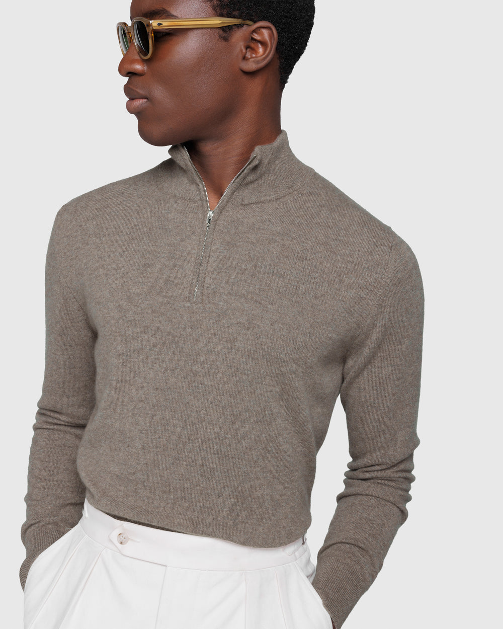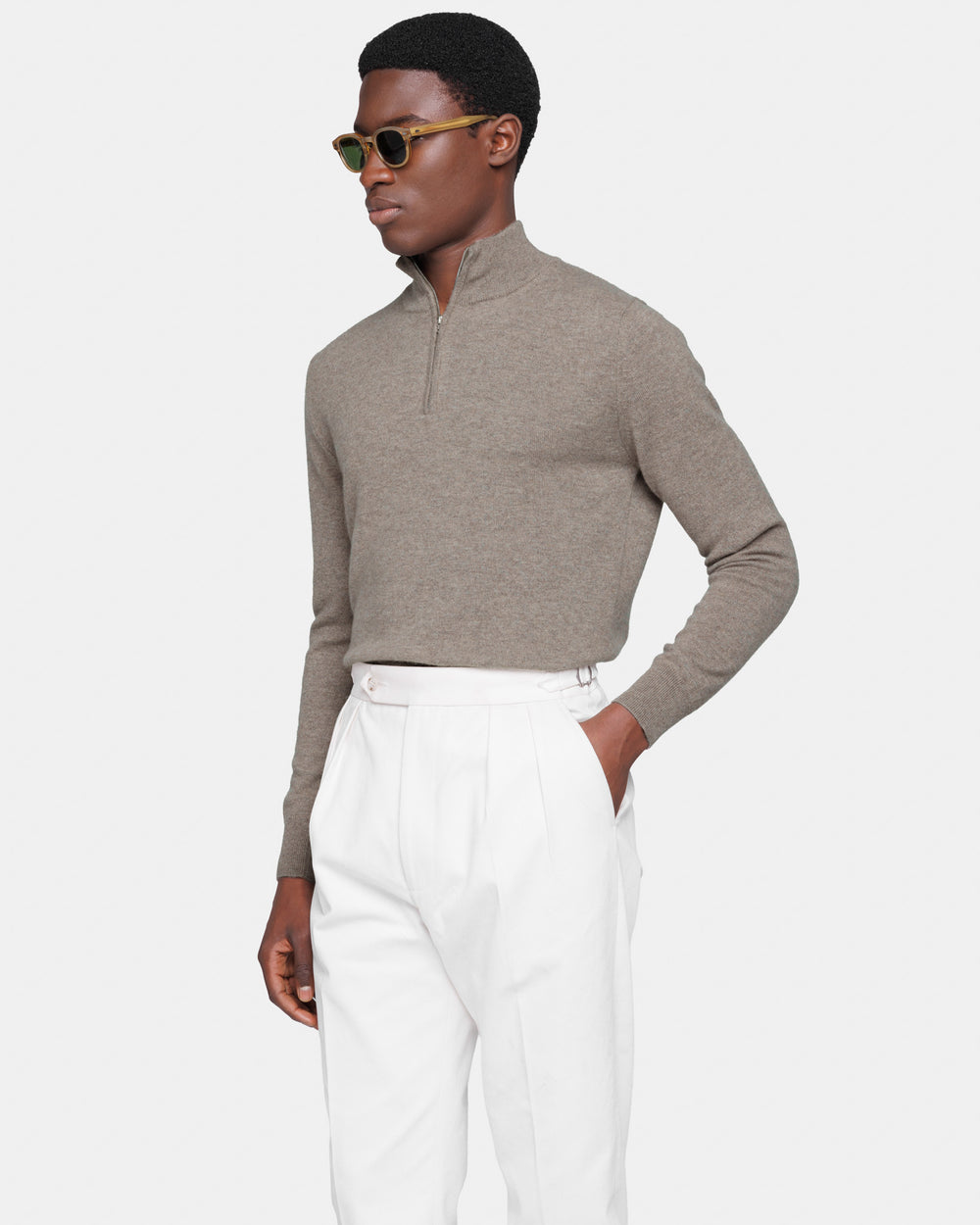Tailor-made 1-ply half zip knit with a 20 cm Riri zipper, 2/27 yarn gauge, long sleeves, in taupe color, made from a precious, refined, and ultra-fine pure cashmere Crown Reserve fiber coming from the most remote regions of Mongolia, then reaching the mills of Quarona Sesia in Piedmont, where it is skillfully processed by the world’s most prestigious spinning mill to give life to a 2/27 carded yarn.