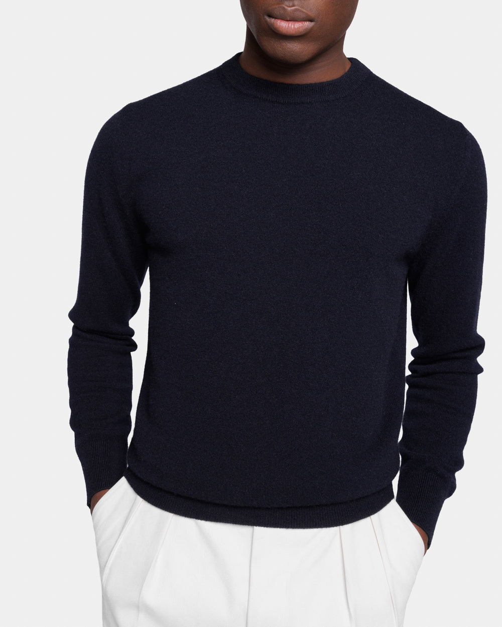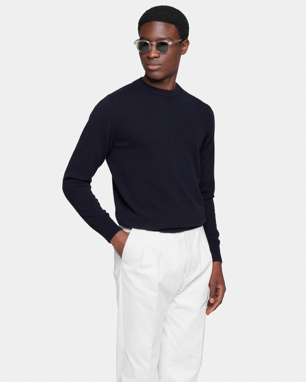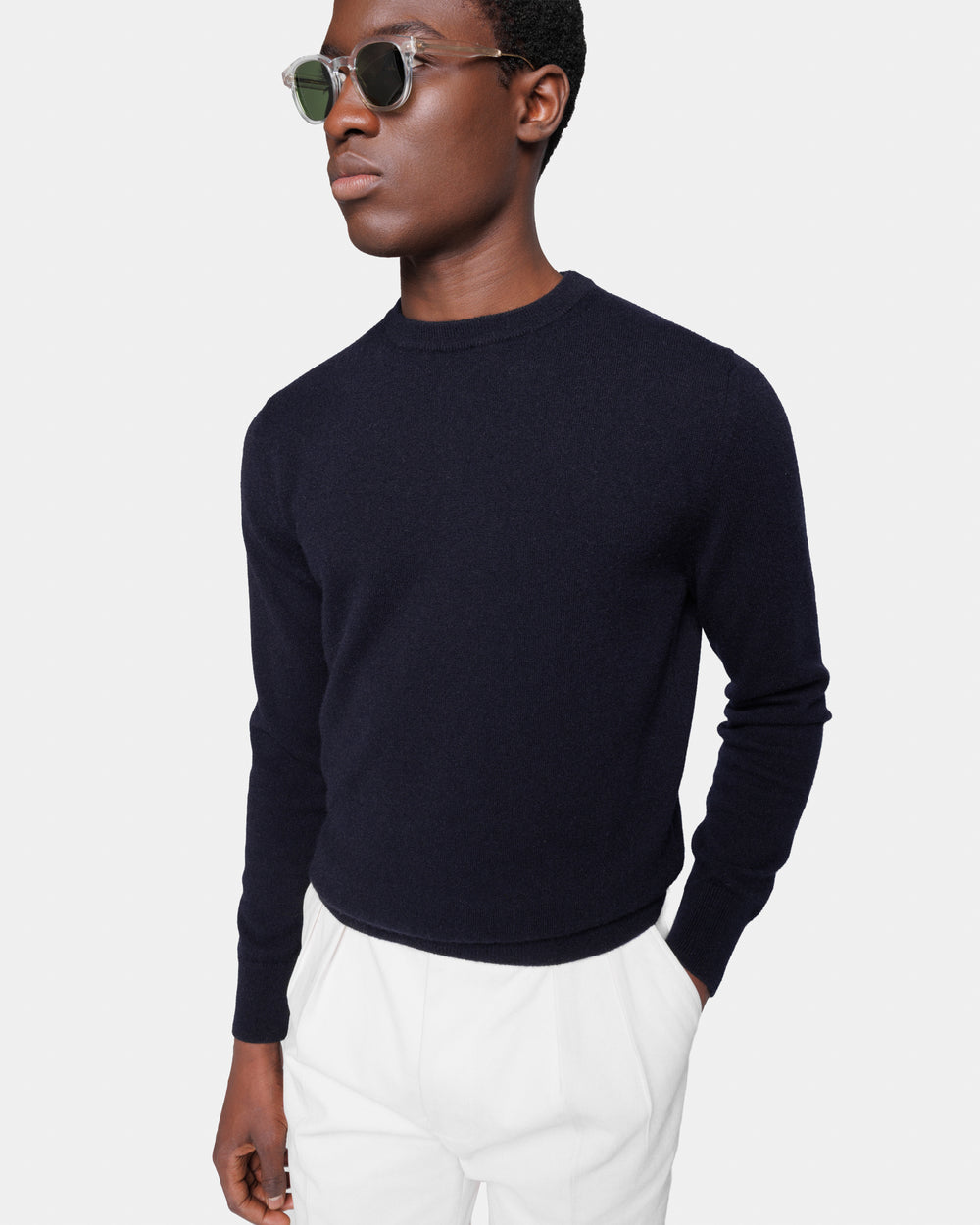Tailor-made 1-ply crewneck knit, 2/27 yarn gauge, long sleeves, in blue color. Made from an exquisite, refined, and ultra-fine pure cashmere Crown Reserve fiber sourced from the most remote regions of Mongolia and brought to the mills of Quarona Sesia in Piedmont, where it is expertly processed by the world’s most prestigious spinner to create a 2/27 carded yarn