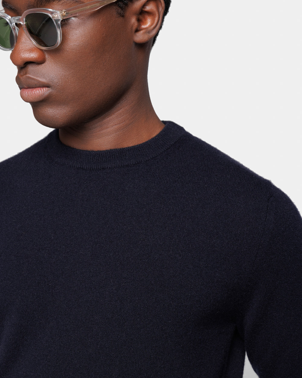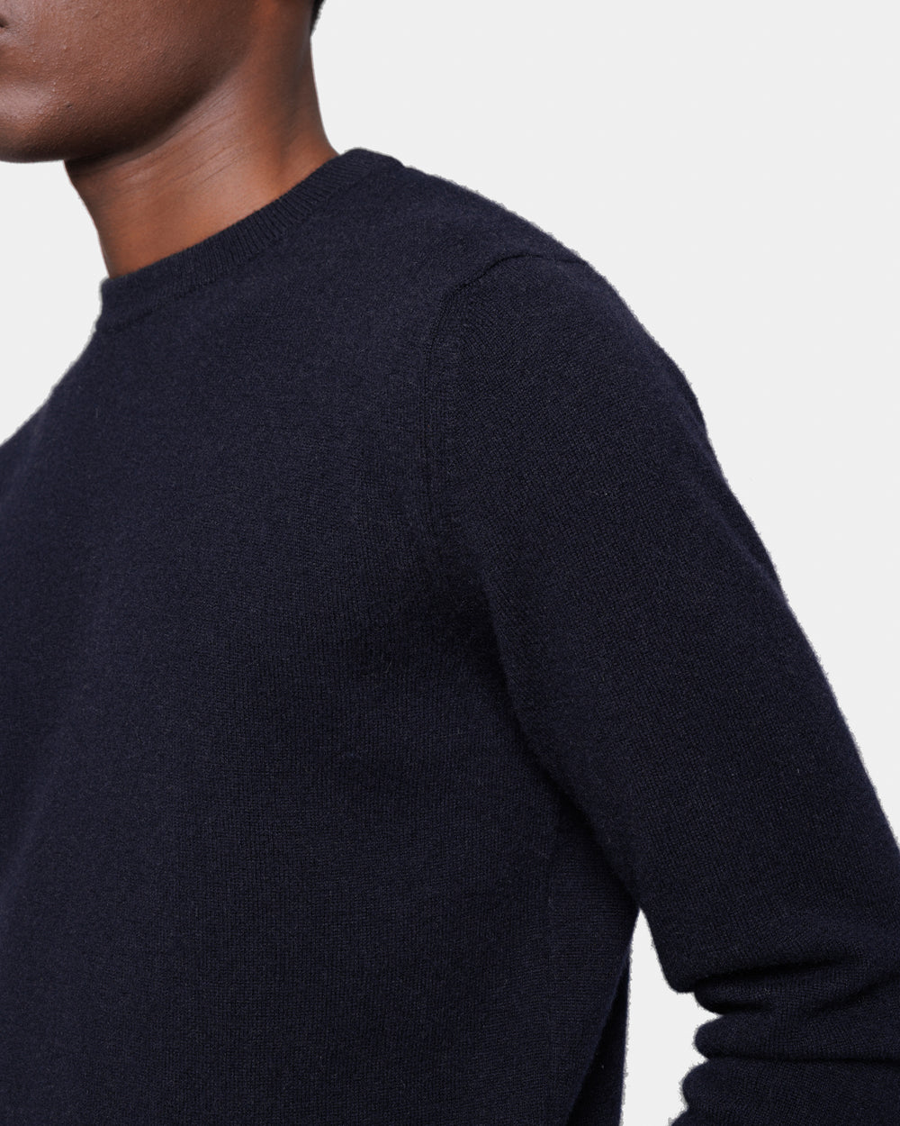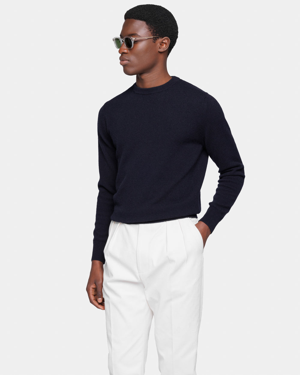 Tailor-made 1-ply crewneck knit, 2/27 yarn gauge, long sleeves, in blue color. Made from an exquisite, refined, and ultra-fine pure cashmere Crown Reserve fiber sourced from the most remote regions of Mongolia and brought to the mills of Quarona Sesia in Piedmont, where it is expertly processed by the world’s most prestigious spinner to create a 2/27 carded yarn