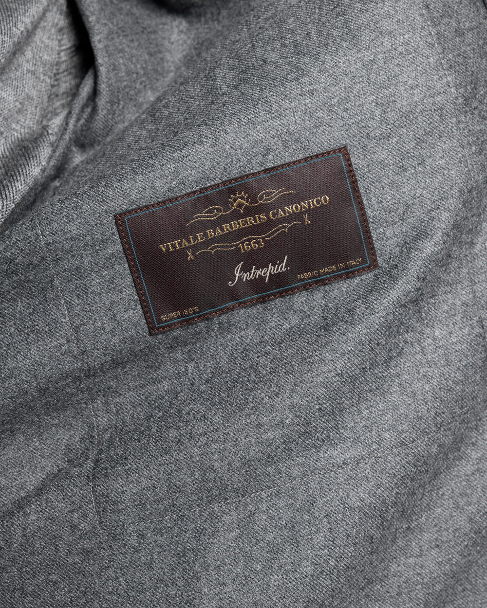 Tailor-made grey solid-color Overshirt with authentic 32 mm Buffalo Horn buttons, crafted from the precious Australian Saxon Merino ‘Intrepid’ Super 150’s wool by Lanificio Vitale Barberis Canonico, a symbol of Made in Italy excellence in the production of fine wools.