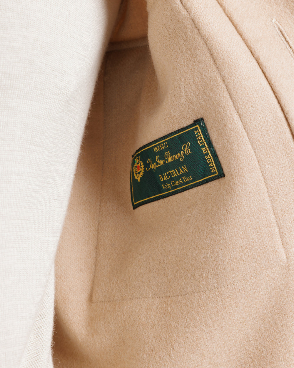 The Bactrian 100% Baby Camel Hair Loro Piana made in Italy fabric is one of the highest expressions of Italian textile luxury. Derived from the first fleece of the Bactrian camel, naturally collected during the molting season, it is an extremely rare fiber, exceptionally fine and soft, comparable to the finest cashmere yet more durable. It offers excellent thermoregulation, providing warmth while remaining breathable, and is ideal for garments such as overshirts thanks to its lightweight yet structured feel. To the touch it is silky, visually elegant and matte, with a natural depth to the sand color. Entirely crafted in Italy, it represents a perfect balance of comfort, refinement, and durability.