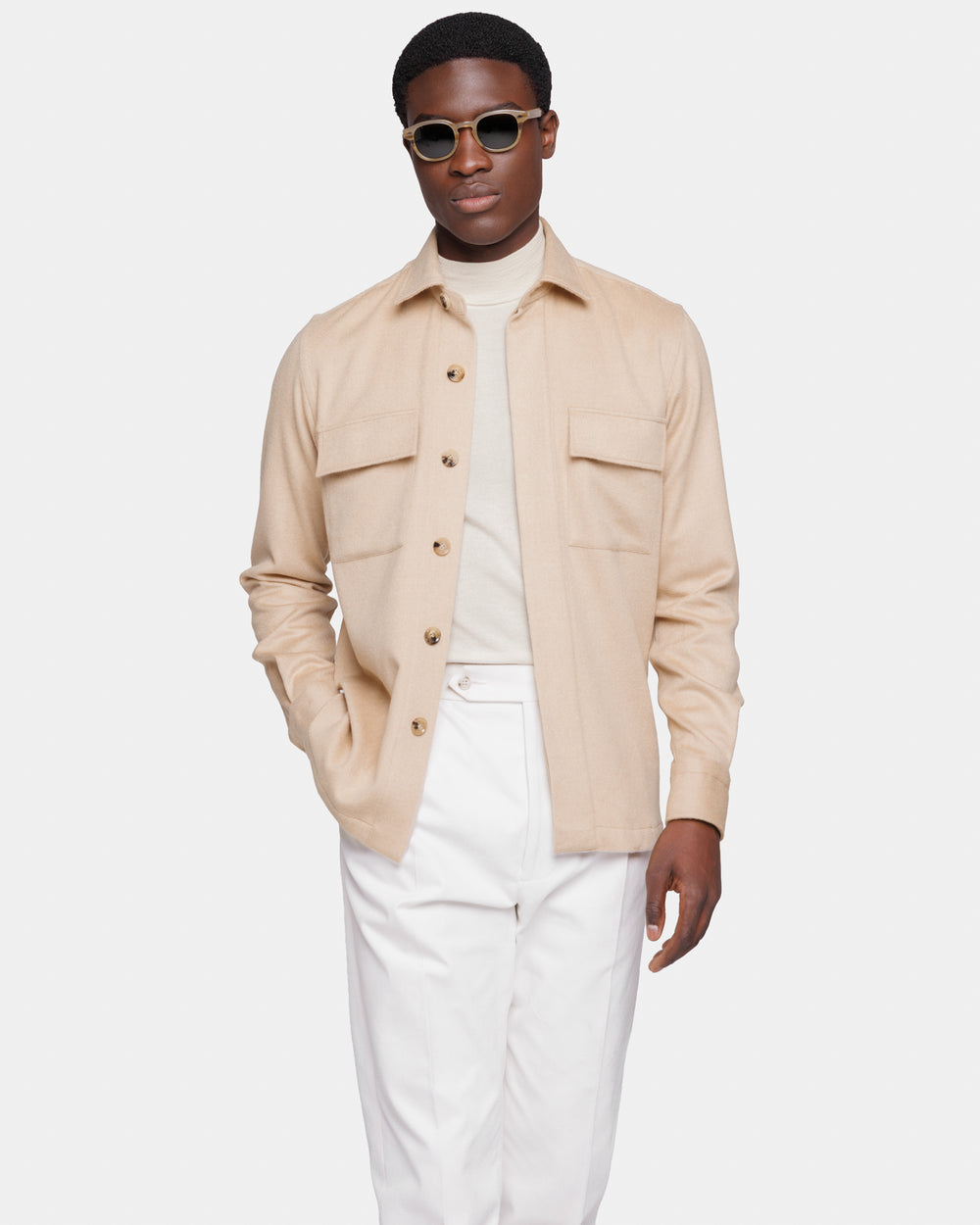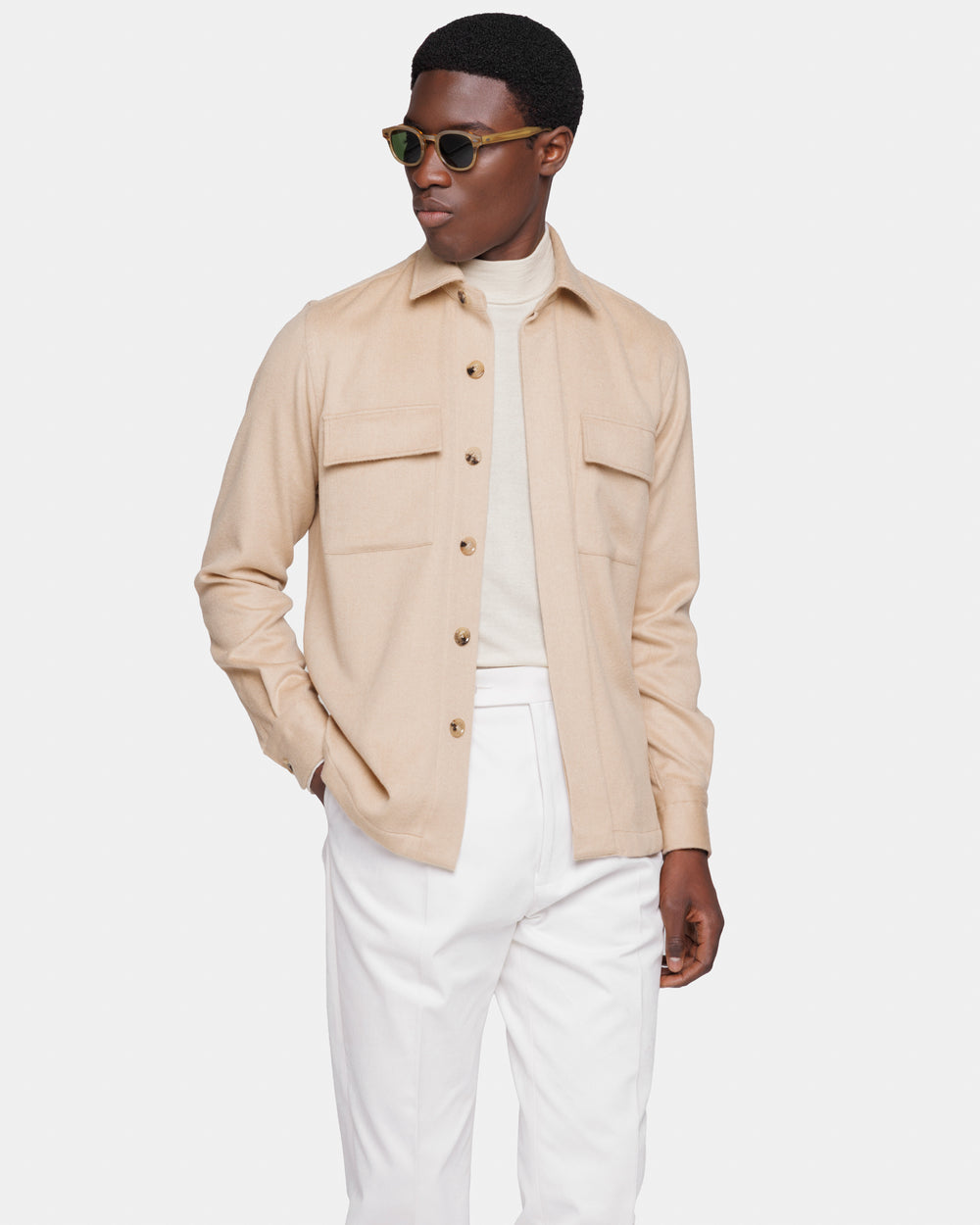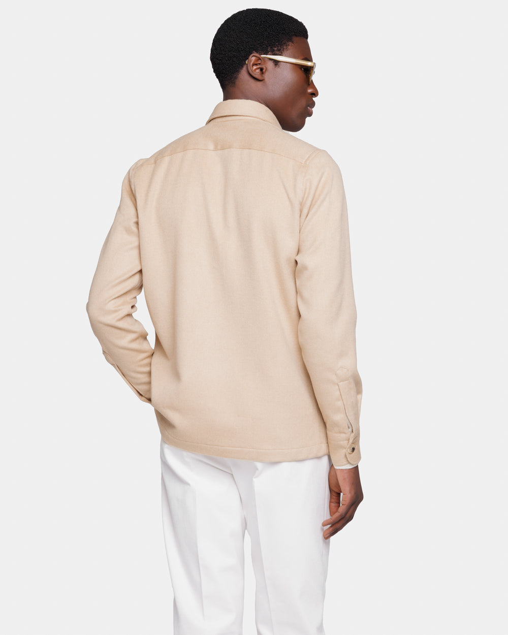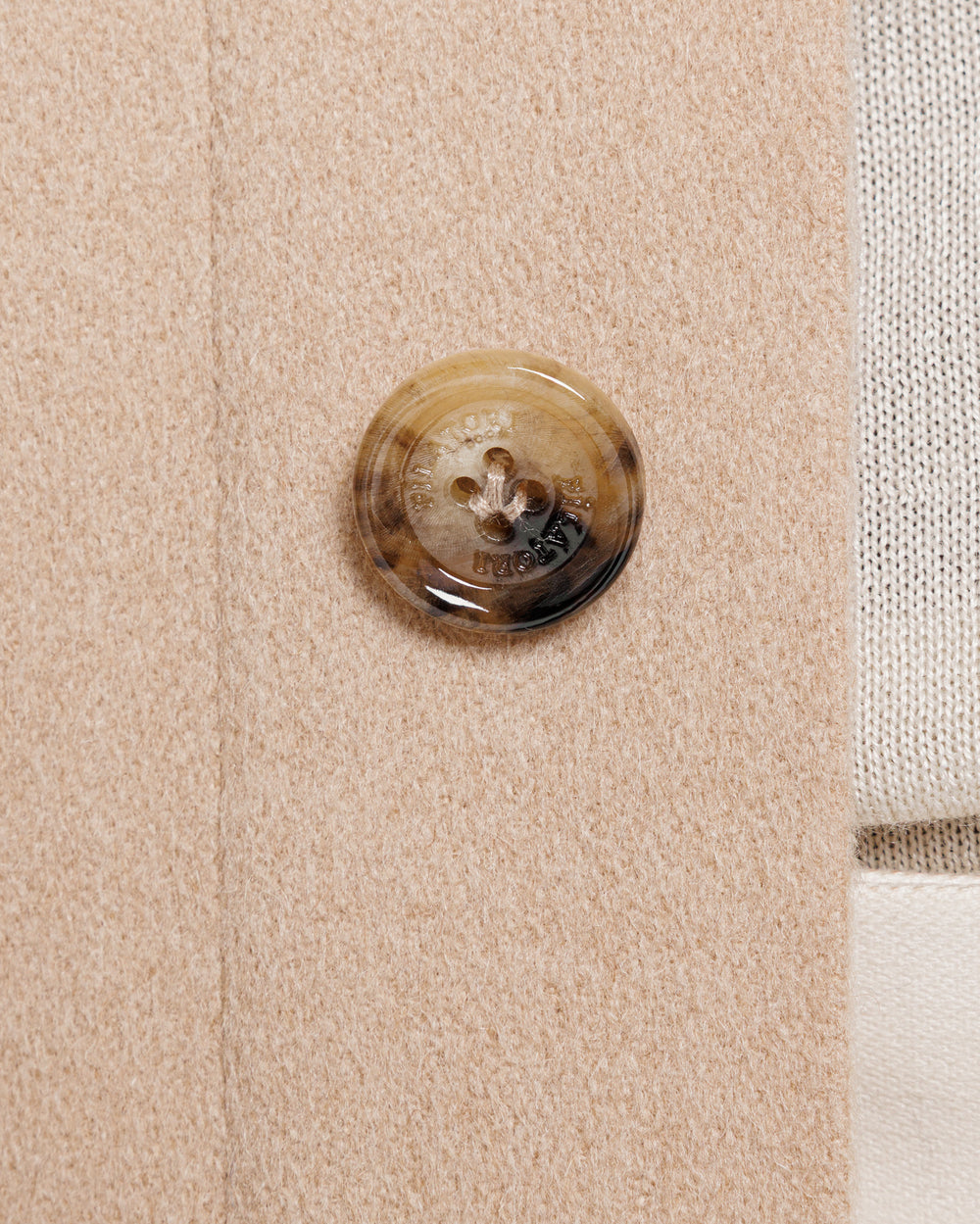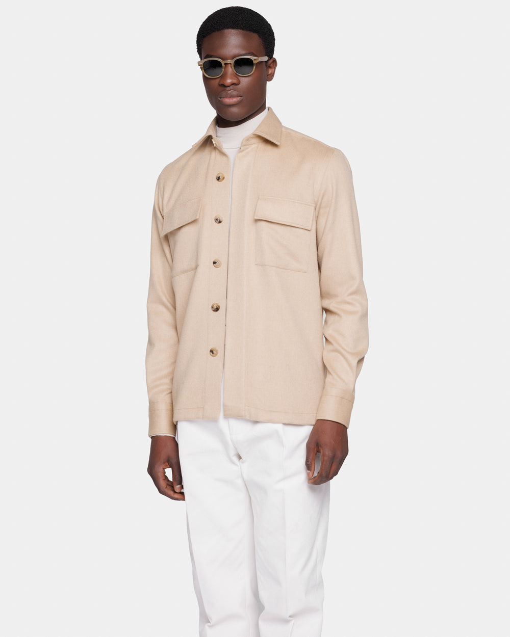 Tailor-made sand solid-color Overshirt with authentic 32 mm Buffalo Horn buttons, crafted from Loro Piana Bactrian 100% Baby Camel Hair fabric, made in Italy.