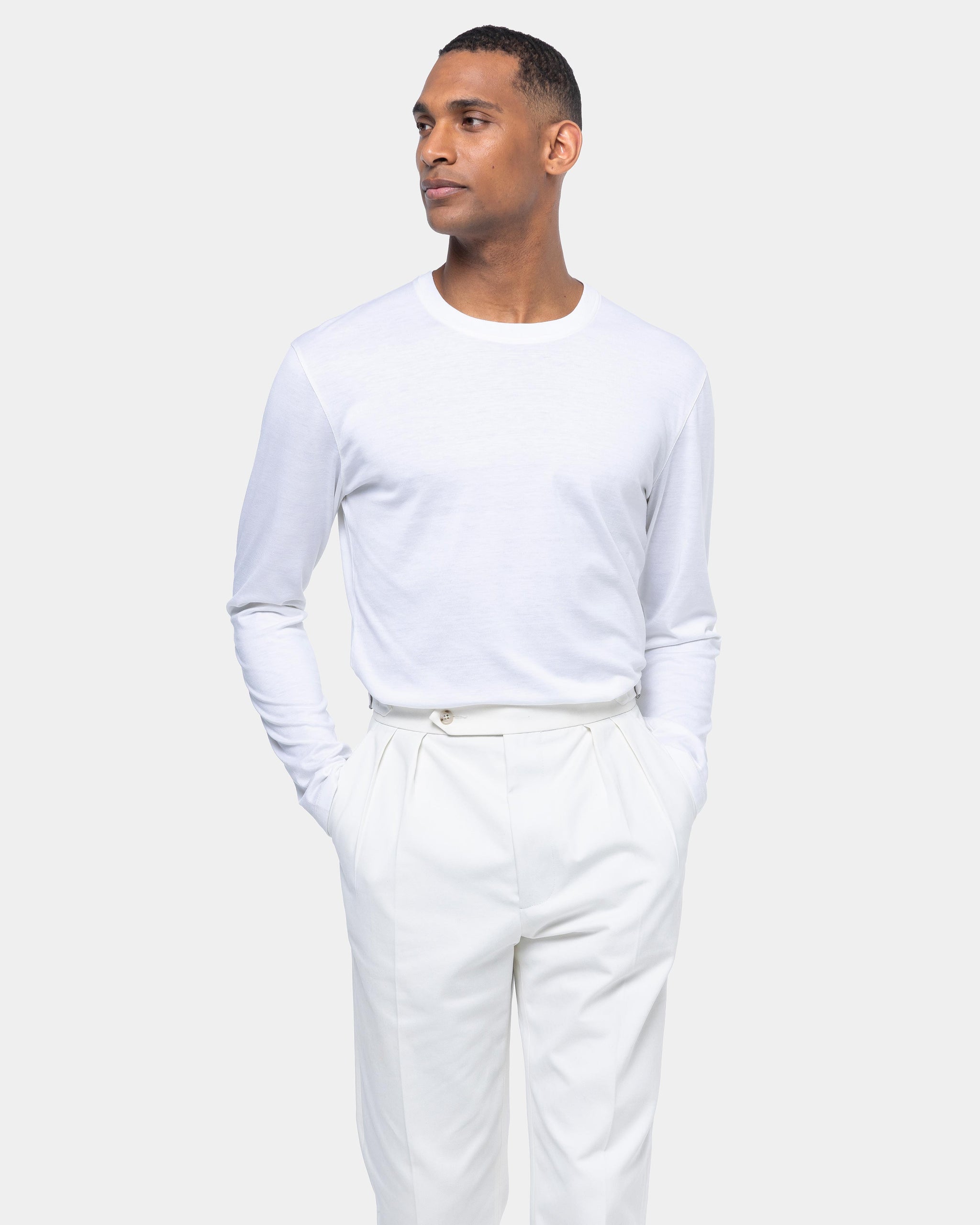 Discover our collection of made-to-measure long-sleeved T-shirts, crafted from soft, luxurious, and ultra-fine Egyptian Makò Filoscozia® cotton 80/2, one of the most precious in the world. Also available in ultra-fine Supima® cotton, with an extraordinary fineness of 120/2, in exclusive silk-cotton jersey 2/115,000, or in rare 100% European Flax linen jersey 1/26,000.