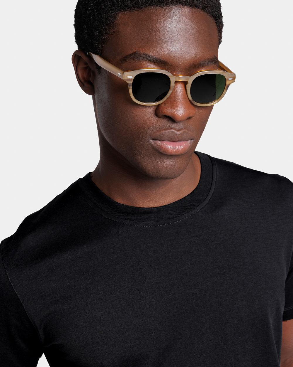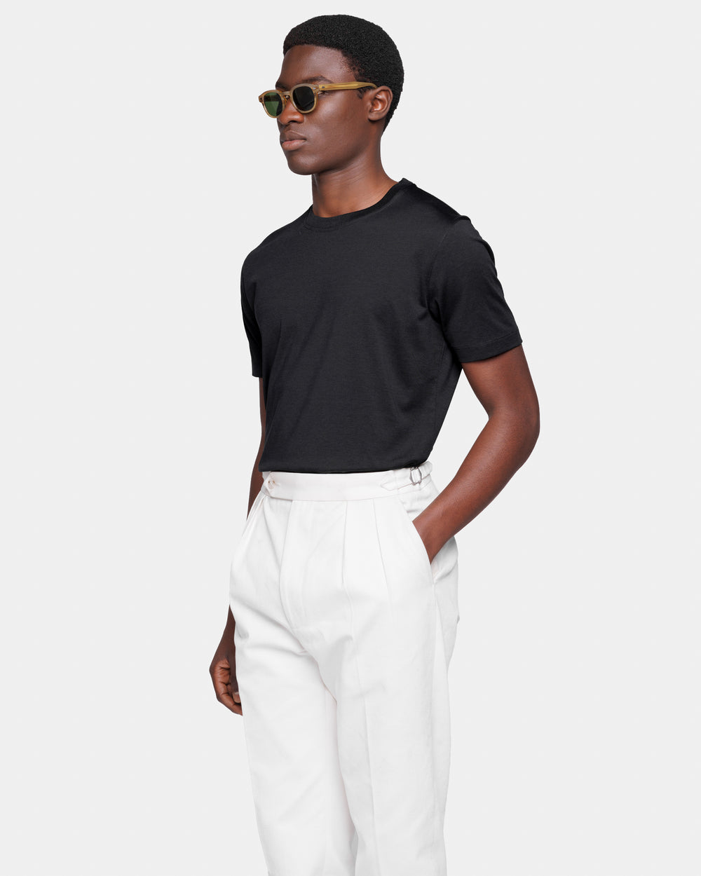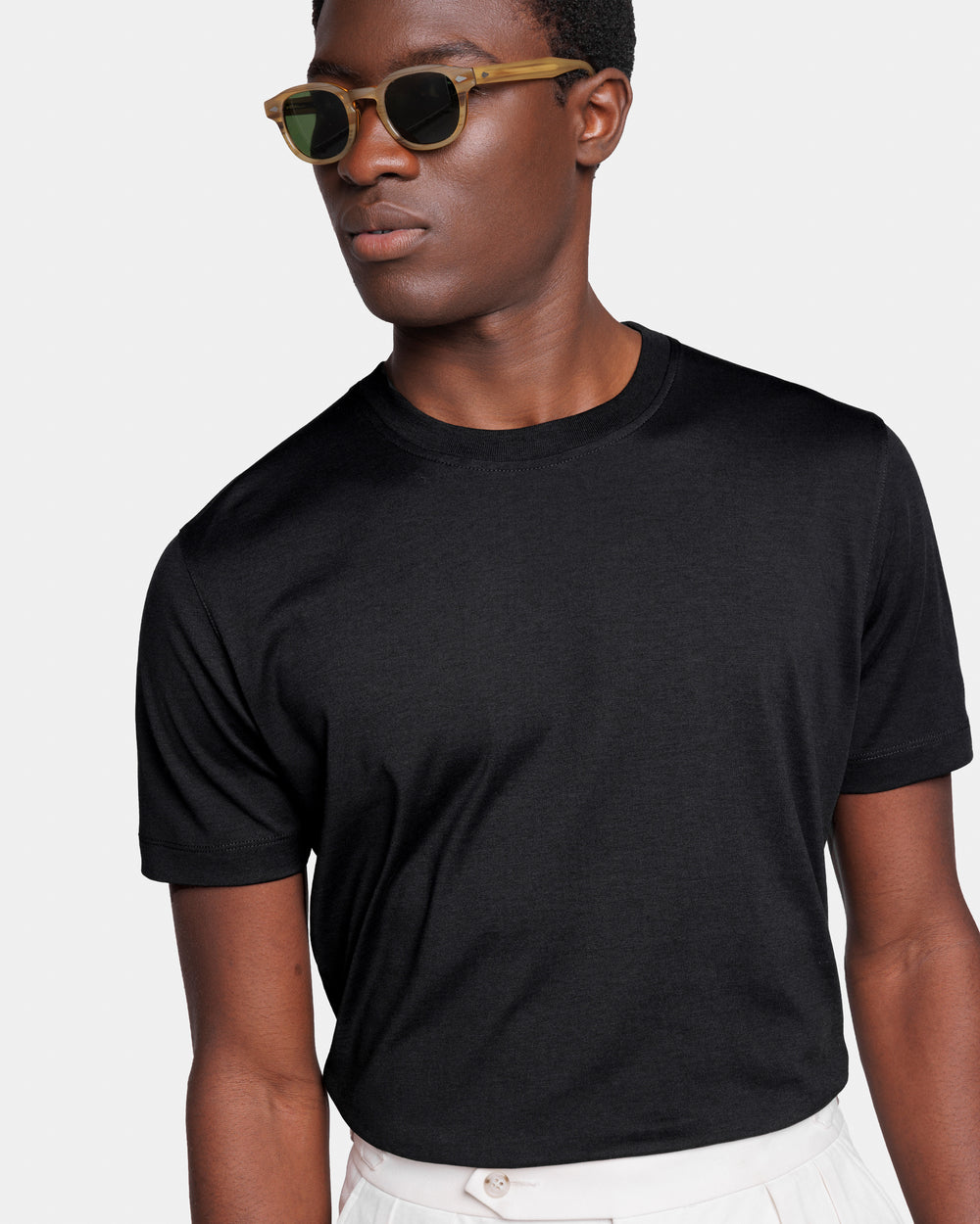 Crafted in the luxurious blend of 60% Mulberry Silk and 40% Organic Cotton jersey 2/115,000, knitted on a 28-gauge frame in black from the Italian weaving mill Maglificio Maggia, it boasts an extraordinarily soft handfeel and a semi-matte appearance. Combining the freshness of cotton with the lightness and luminosity of silk, it evokes the summer atmospheres of remote islands and the decidedly relaxed spirit of our collections.