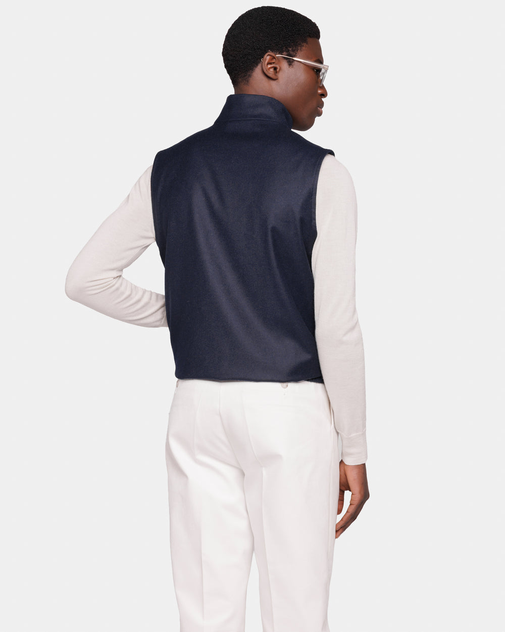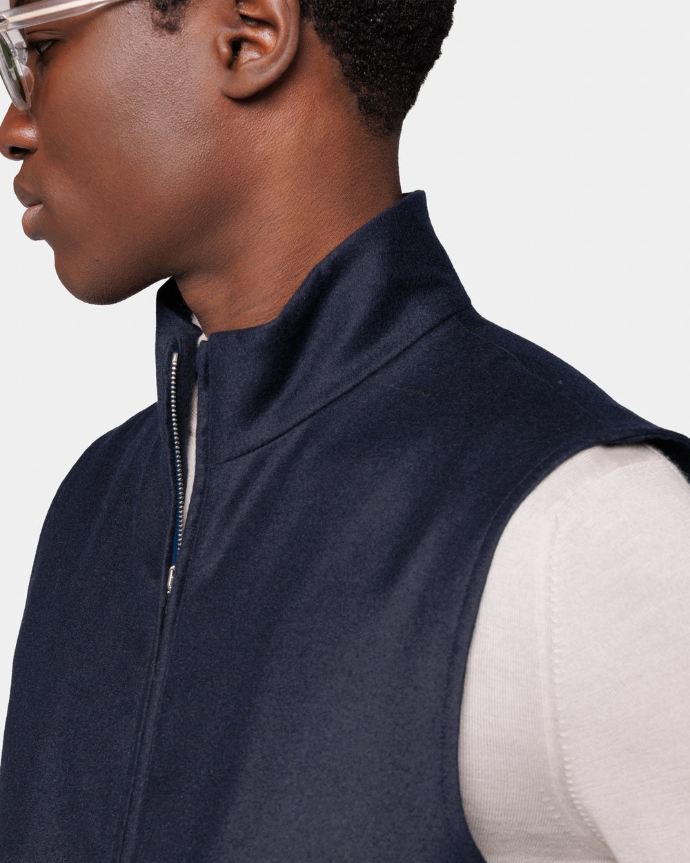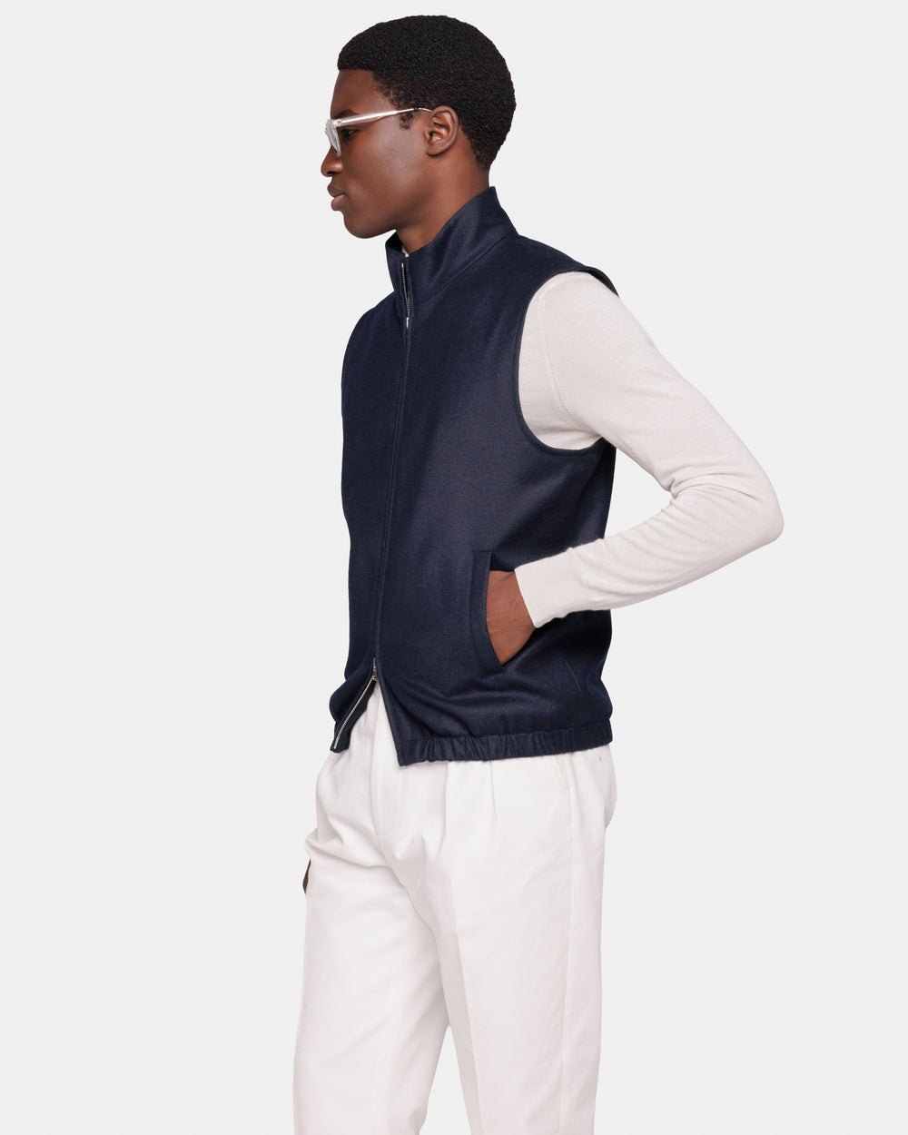 Tailor-made blue vest in water-repellent 95% wool and 5% cashmere fabric, unpadded, with stand collar and double-zip front, designed for impeccable layering and elevated functionality in the contemporary wardrobe.