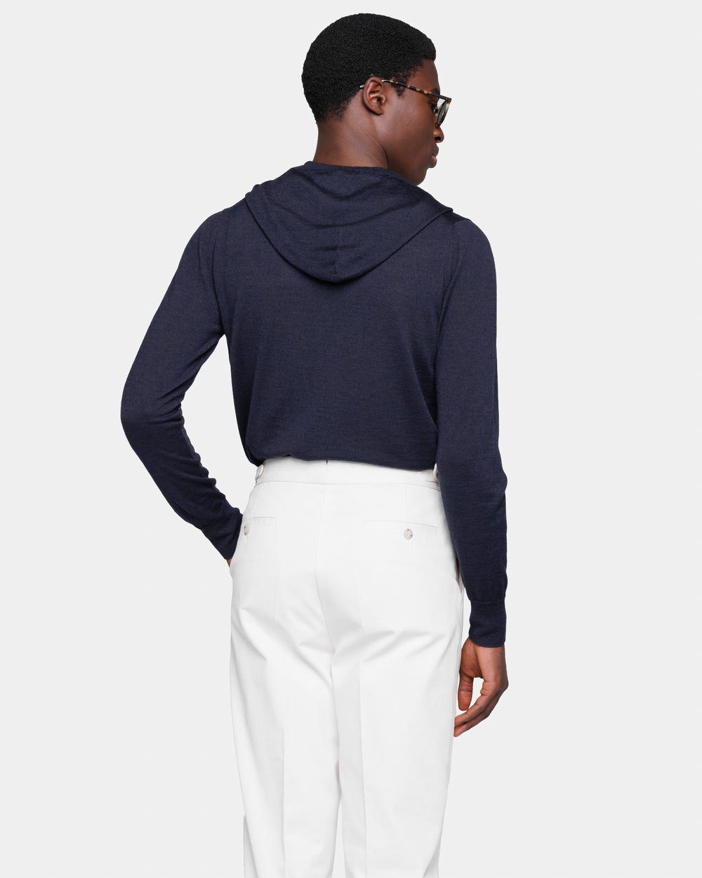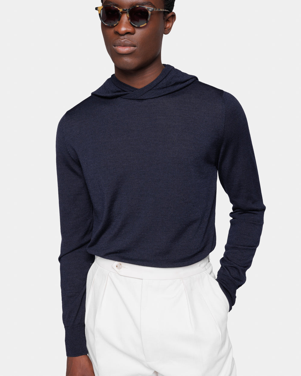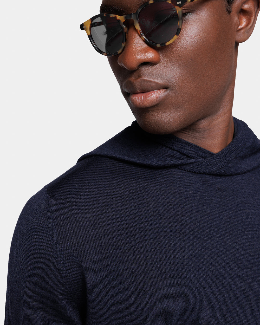 Tailor-made long sleeved hoodie knitwear in Extrafine 2/48 Gauge Yarn, Navy Blue. Crafted from a luxurious, bright, and soft blend of 70% Extrafine Merino Wool and 30% Silk of exceptional quality.