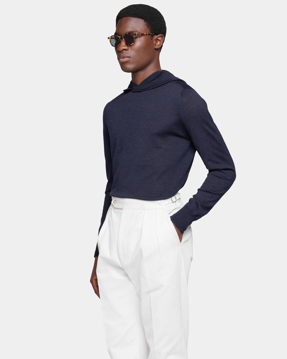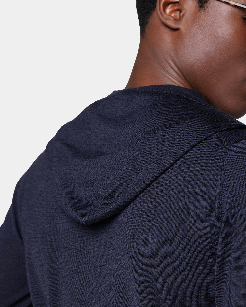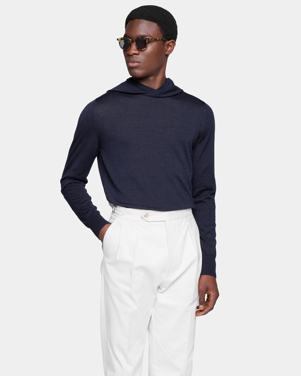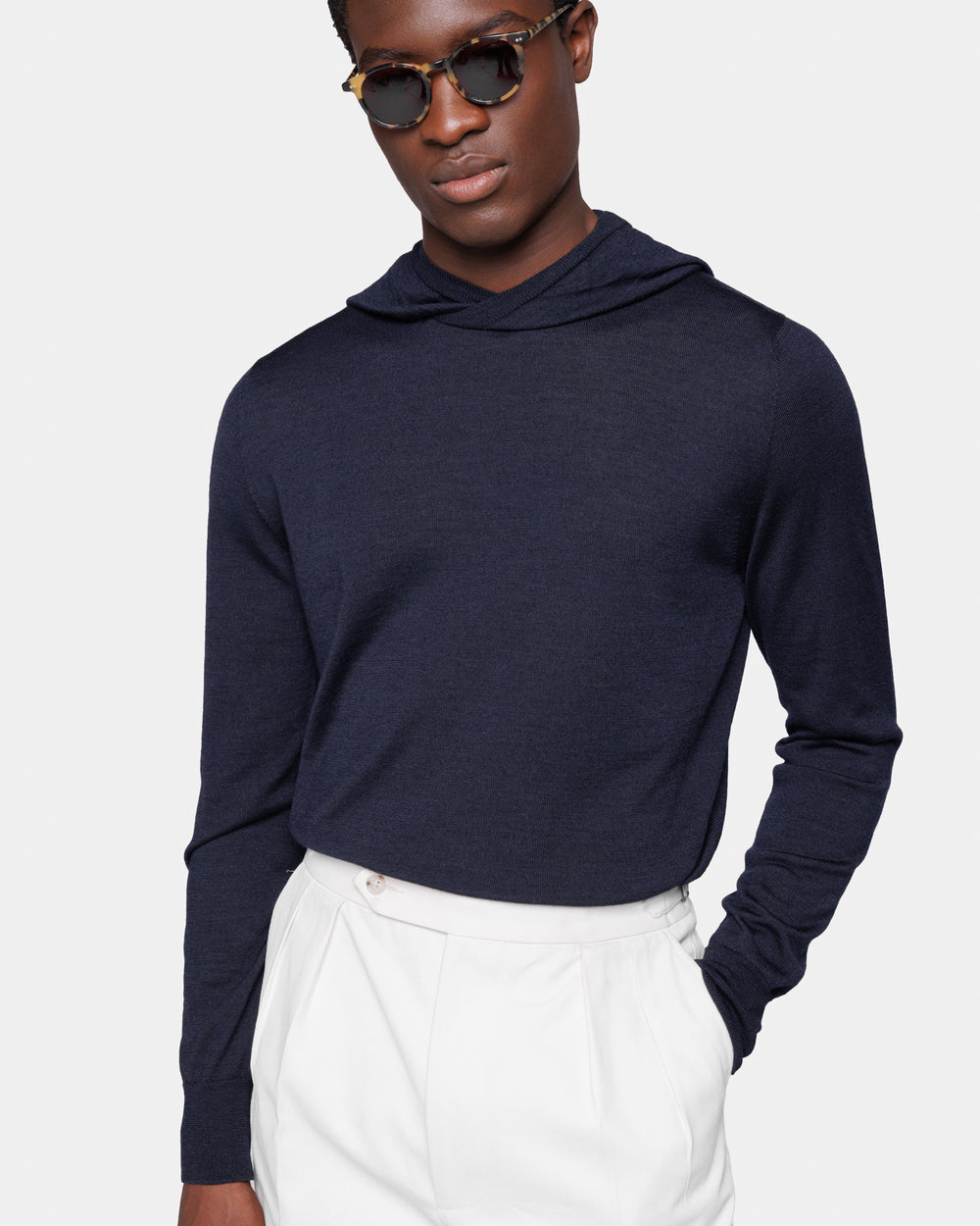 Tailor-made long sleeved hoodie knitwear in Extrafine 2/48 Gauge Yarn, Navy Blue. Crafted from a luxurious, bright, and soft blend of 70% Extrafine Merino Wool and 30% Silk of exceptional quality.