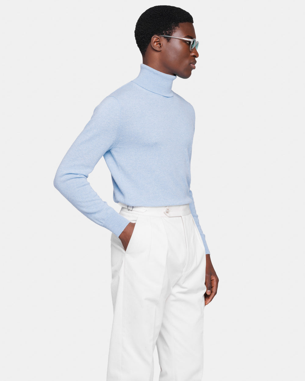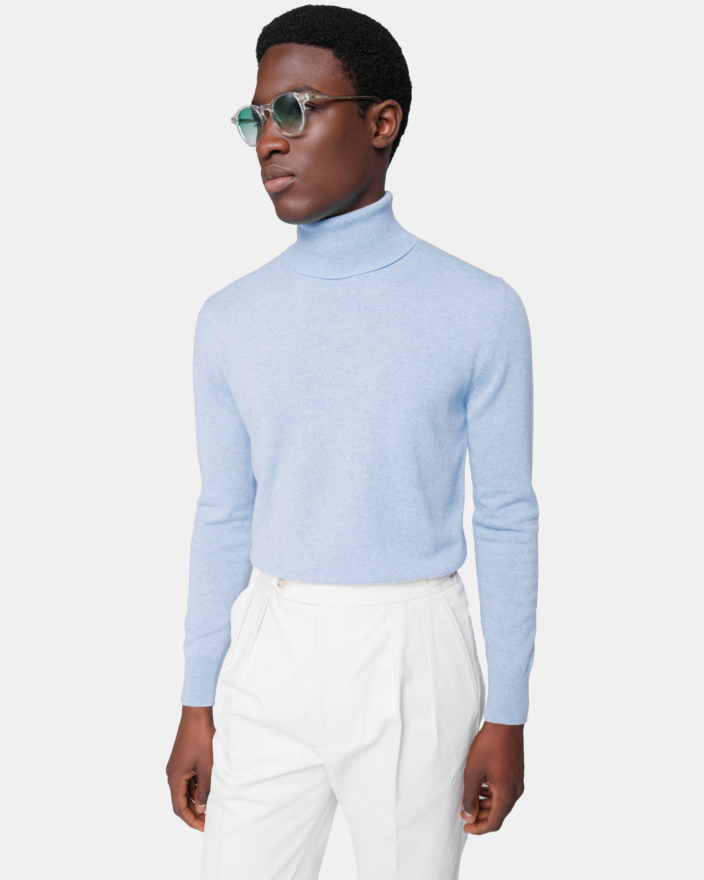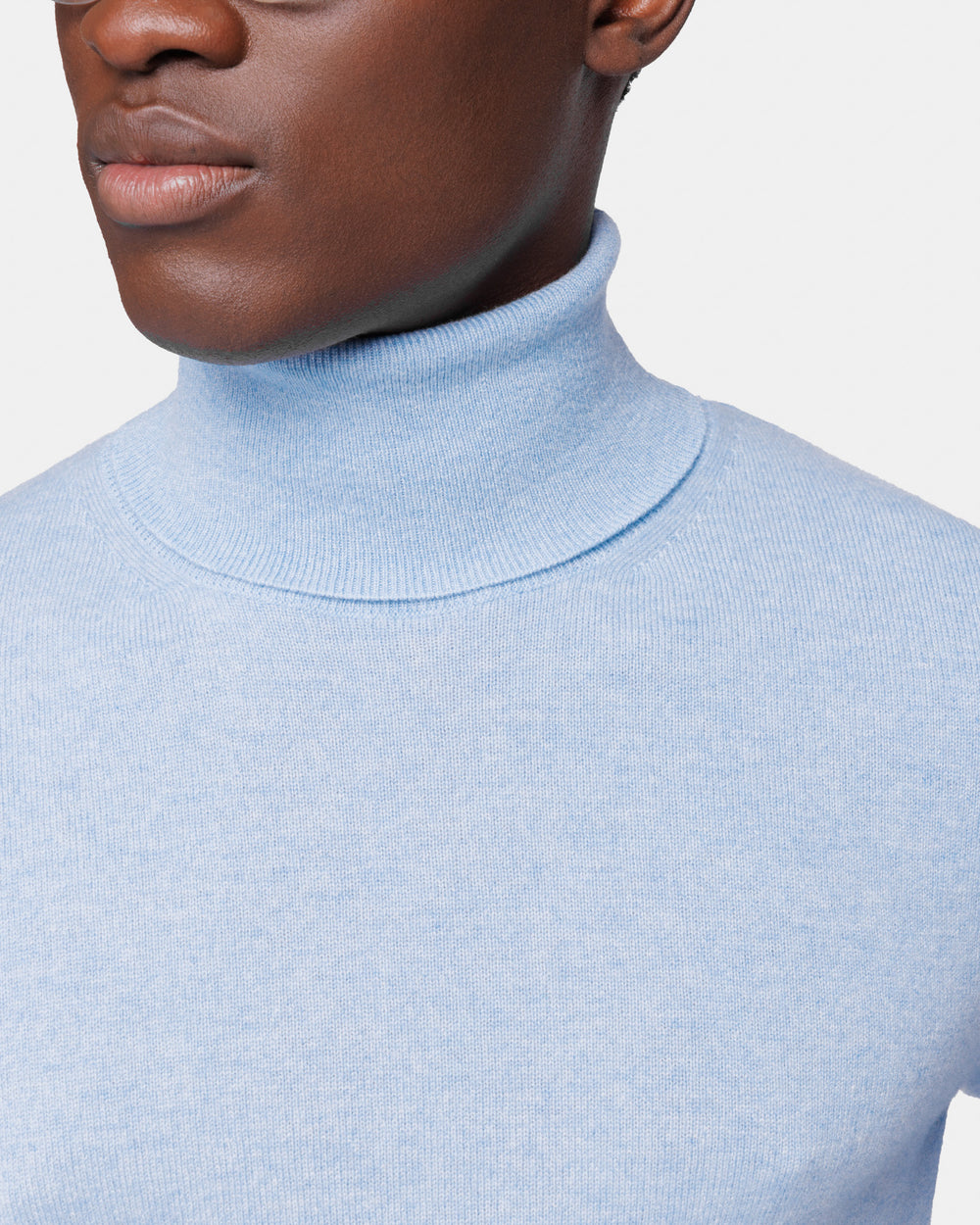Tailor-made 1-ply turtleneck knit, 2/27 yarn gauge, long sleeves, in sky blue color, made from a precious, refined, and ultra-fine pure cashmere Crown Reserve fiber coming from the most remote regions of Mongolia, then reaching the mills of Quarona Sesia in Piedmont, where it is skillfully processed by the world’s most prestigious spinning mill to give life to a 2/27 carded yarn.