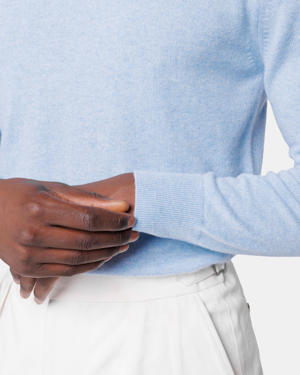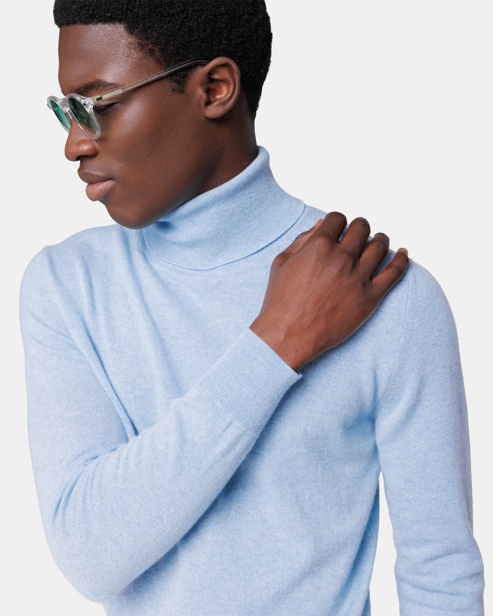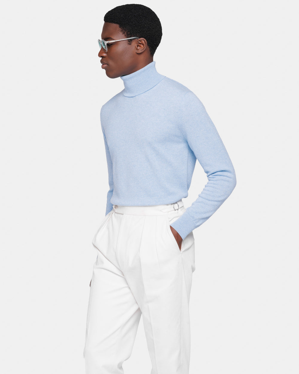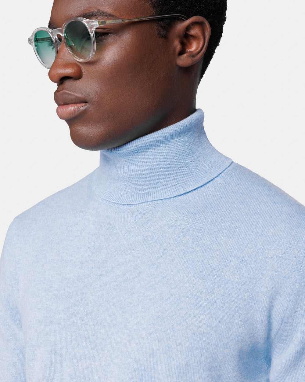 Tailor-made 1-ply turtleneck knit, 2/27 yarn gauge, long sleeves, in sky blue color, made from a precious, refined, and ultra-fine pure cashmere Crown Reserve fiber coming from the most remote regions of Mongolia, then reaching the mills of Quarona Sesia in Piedmont, where it is skillfully processed by the world’s most prestigious spinning mill to give life to a 2/27 carded yarn.