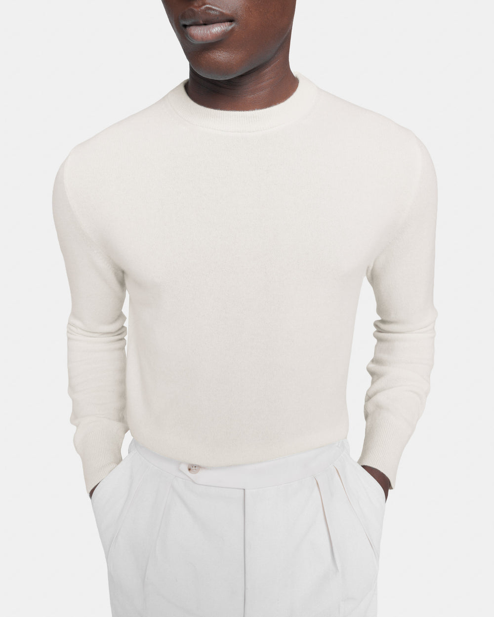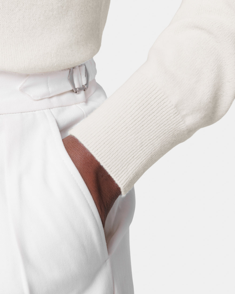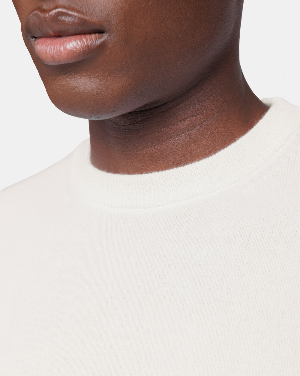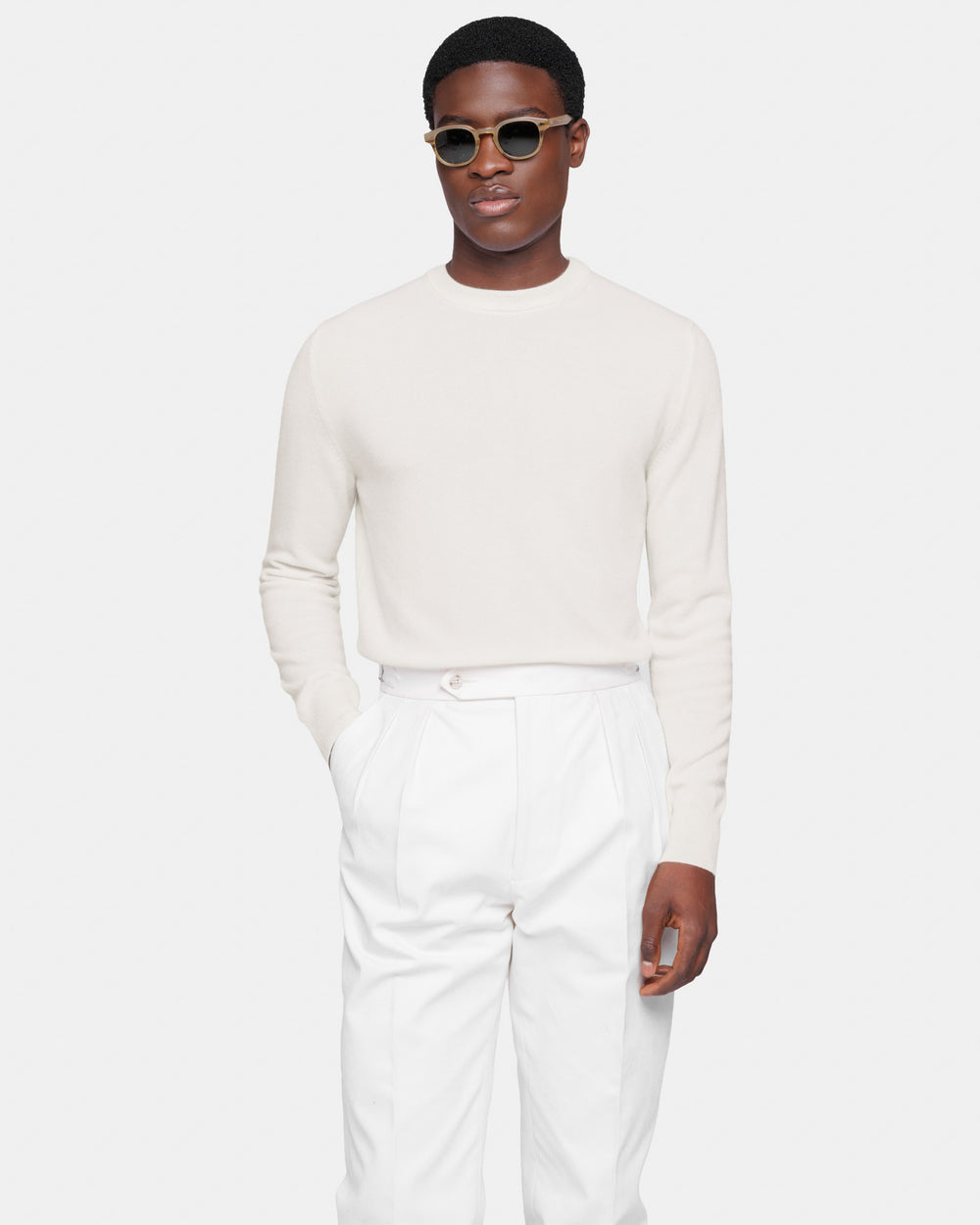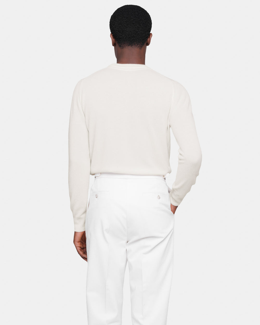 Tailor-made 1-ply crewneck knit, 2/27 yarn gauge, long sleeves, in off-white color. Made from an exquisite, refined, and ultra-fine pure cashmere Crown Reserve fiber sourced from the most remote regions of Mongolia and brought to the mills of Quarona Sesia in Piedmont, where it is expertly processed by the world’s most prestigious spinner to create a 2/27 carded yarn
