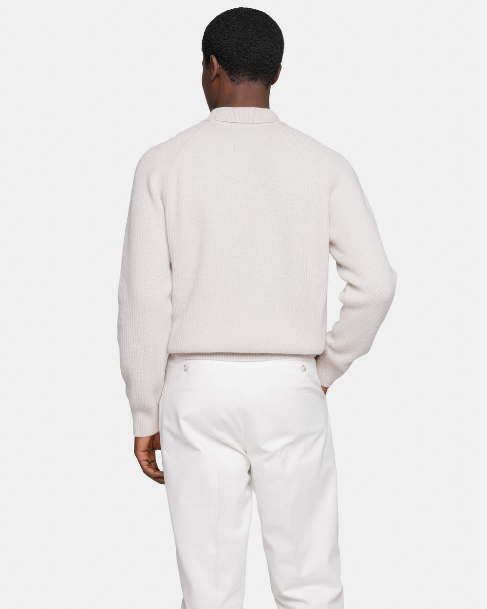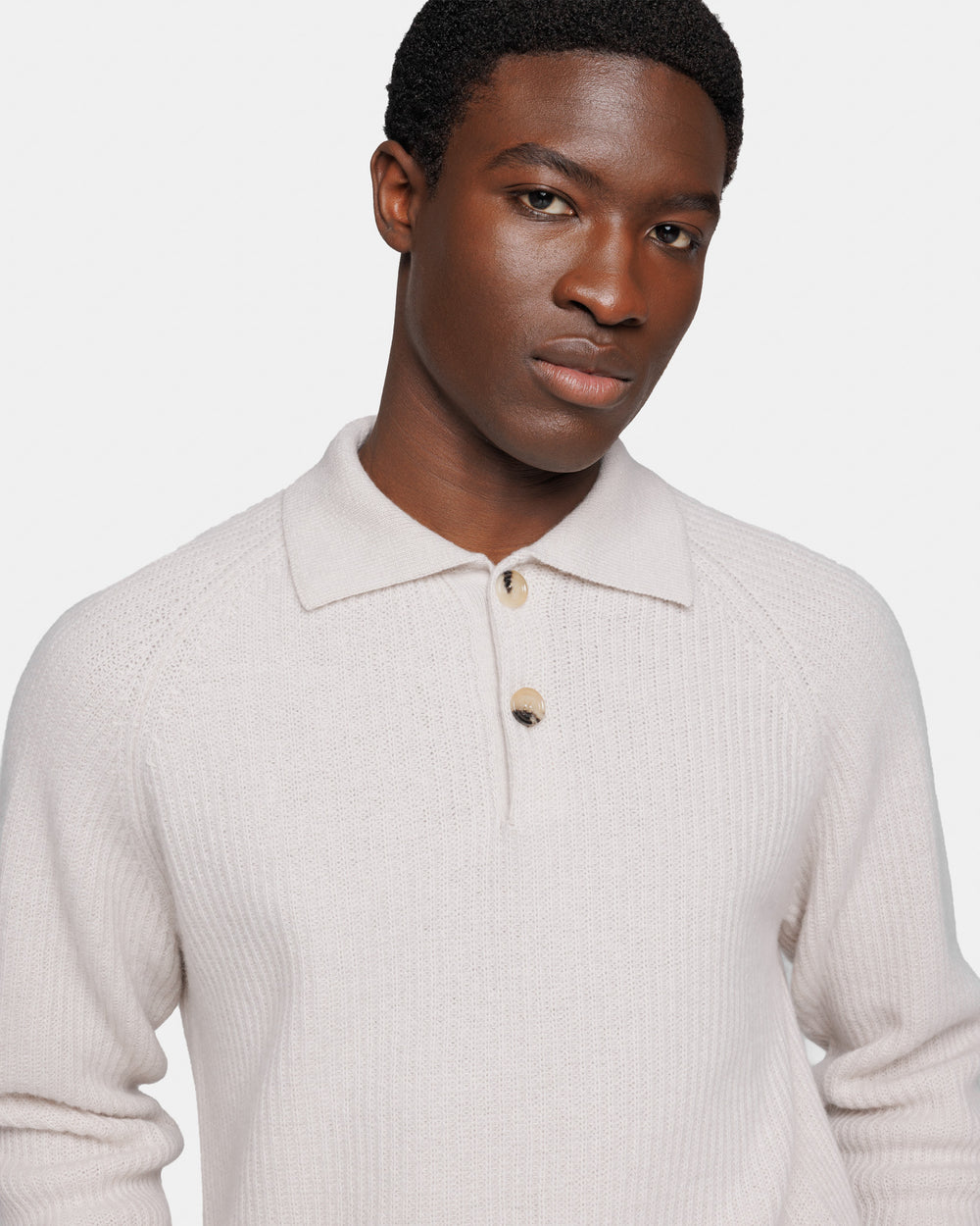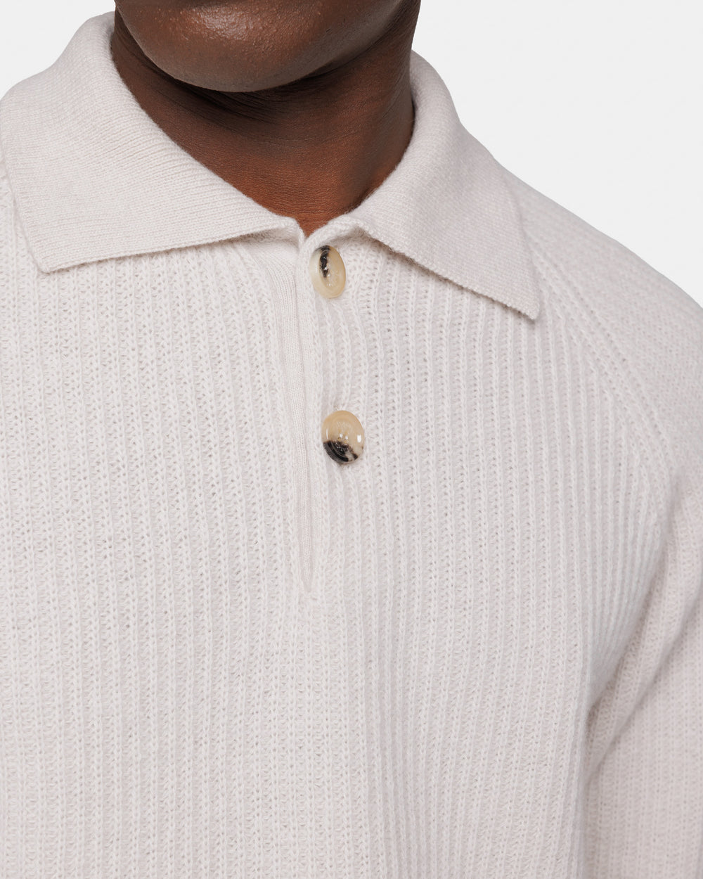 Polo knitwear with two authentic 32 mm horn buttons in 2-ply superfine yarn, 1/15 NM, long sleeves, solid meringue, made with luxurious Super 100's Carded Wool, a premium wool fiber known for its softness and warmth. The carded wool, subjected to the traditional carding process, gives the yarn a voluminous, soft texture and unique thermal properties, thanks to the microscopic air bubbles trapped between the fibers.