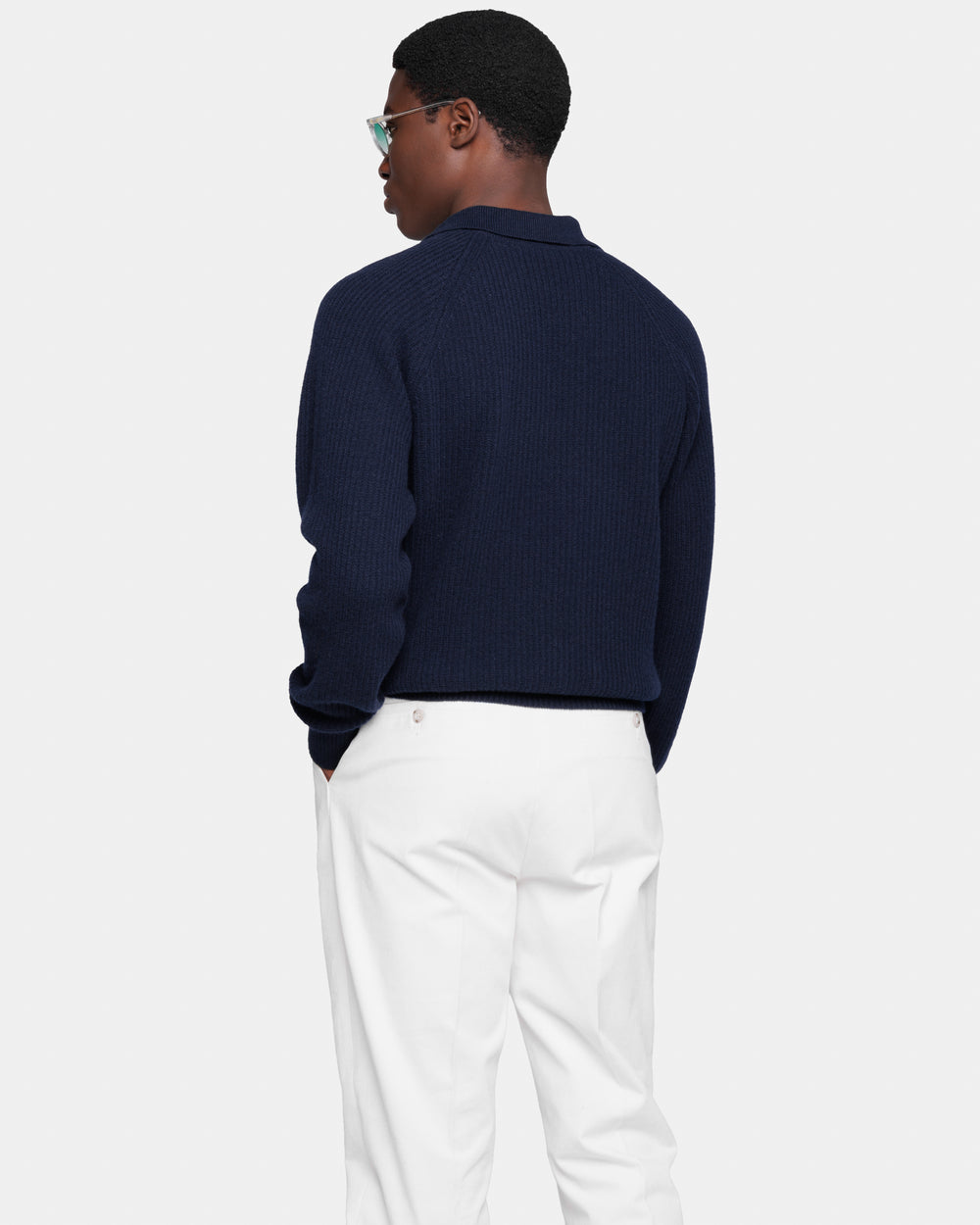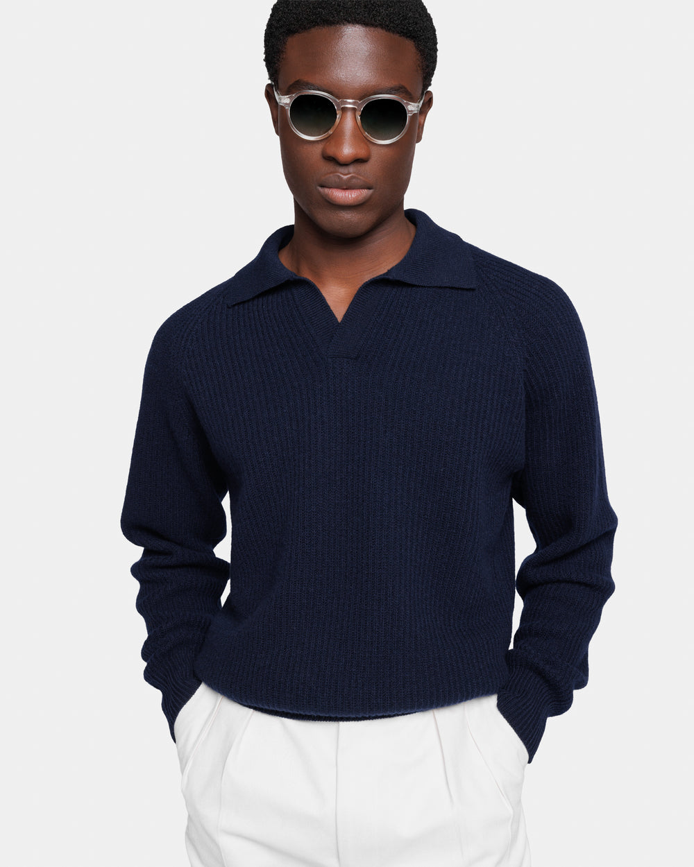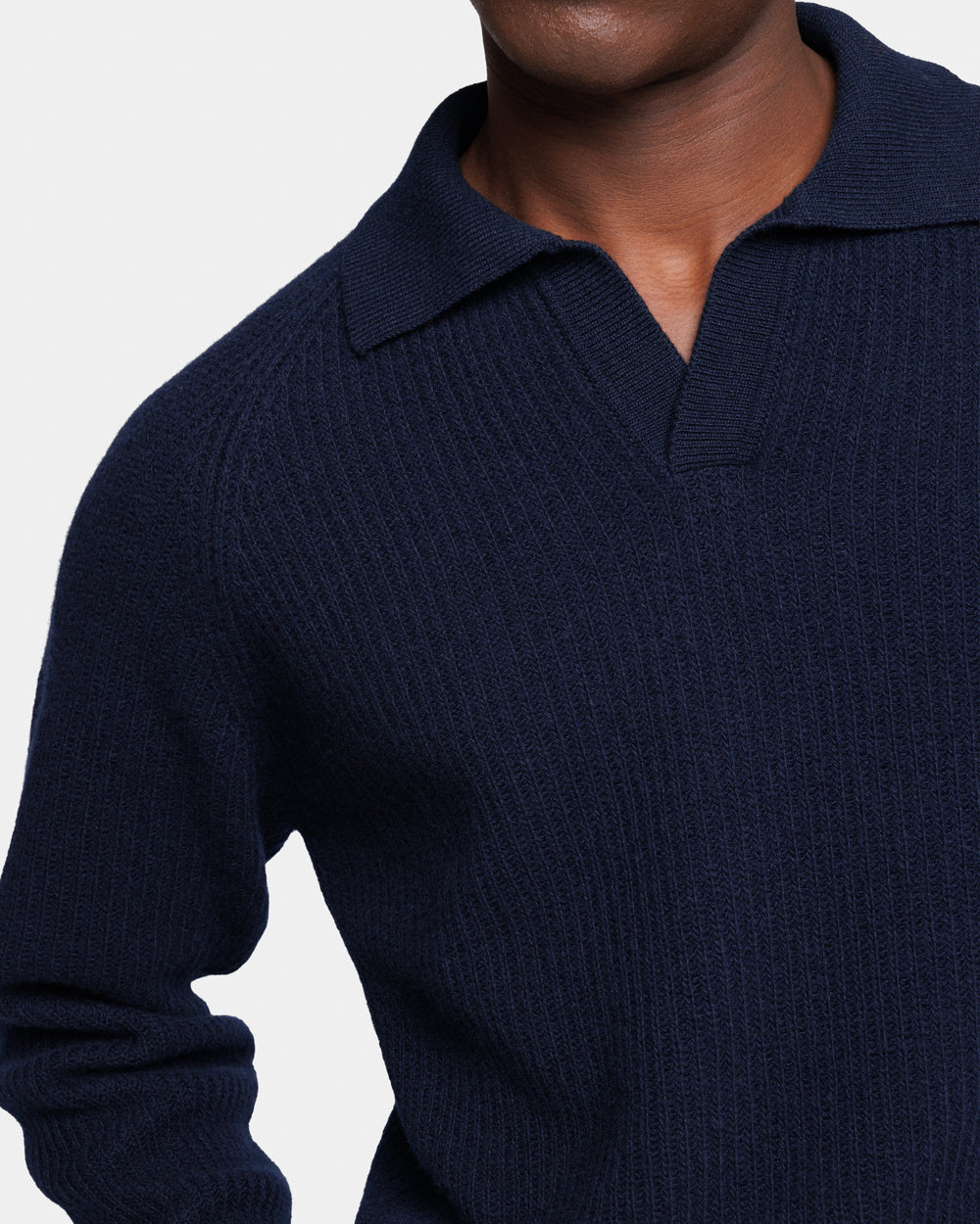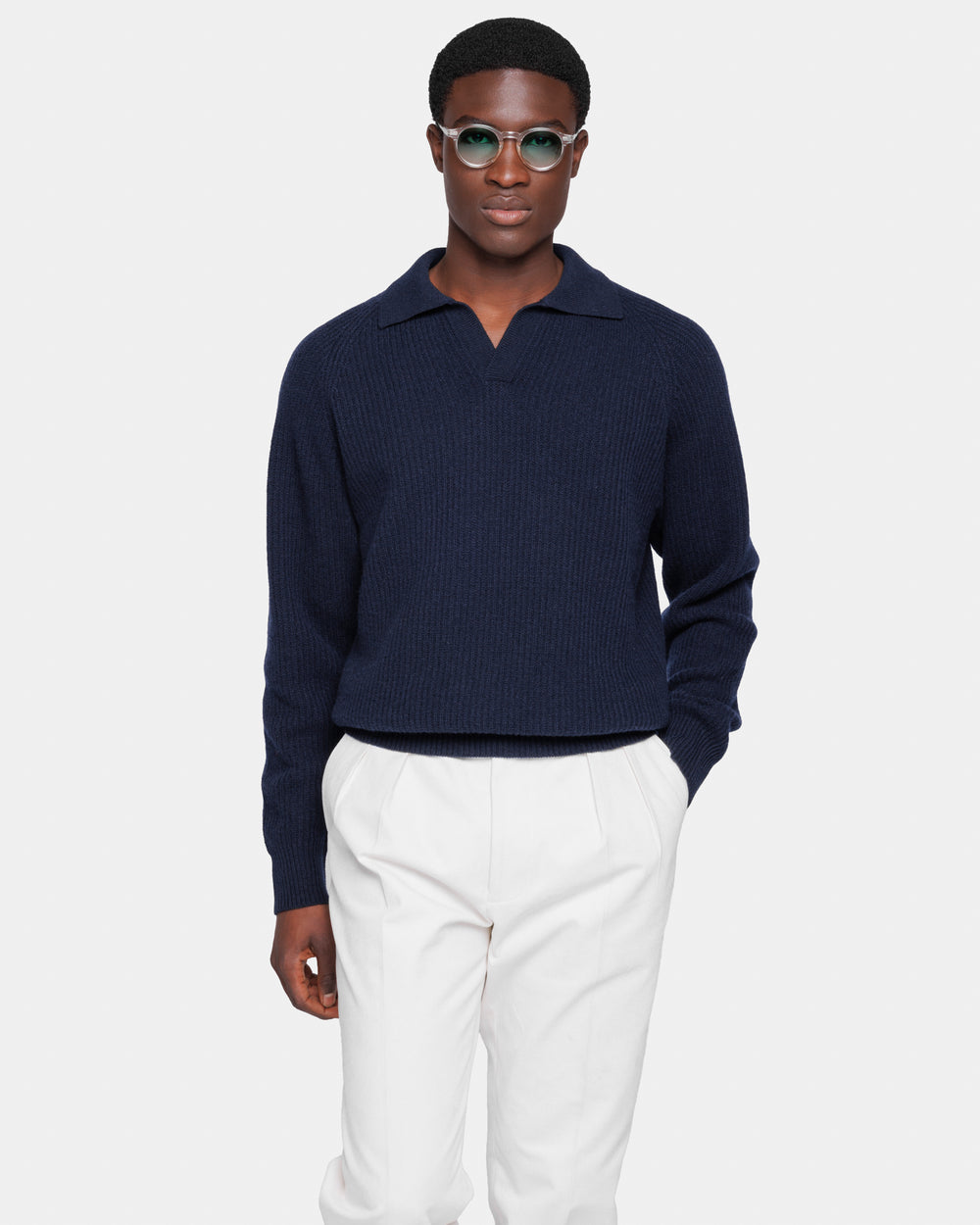 Buttonless polo knitwear in 2-ply superfine yarn, 1/15 NM, long sleeves, solid blue, made with luxurious Super 100's Carded Wool, a premium wool fiber known for its softness and warmth. The carded wool, subjected to the traditional carding process, gives the yarn a voluminous, soft texture and unique thermal properties, thanks to the microscopic air bubbles trapped between the fibers.